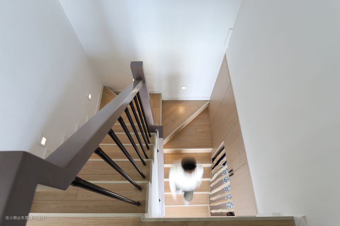 楼梯的位置,换了方向后的楼梯,上下动线都非常的顺畅。楼梯是现场钢结构施工的哦,这样也可以节省费用和时间,铺上木地板,立体感十足。