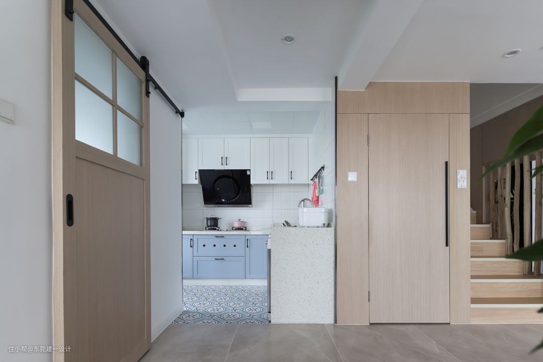 原1层卫生间内移,扩大厨房空间;厨房地砖选用玄关的200*200小蓝花砖,与客厅处分区拉直橱柜与楼梯和玄关柜,整体性很强,也特定了彼此的空间感。
