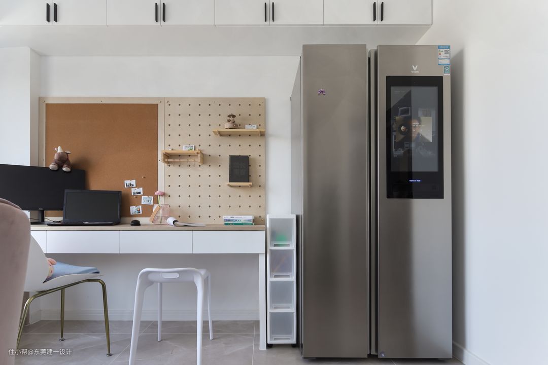 书桌与双门冰箱的空位,刚好容纳小小的饮食收纳推车;非常方便实用。小推车是淘宝购买。