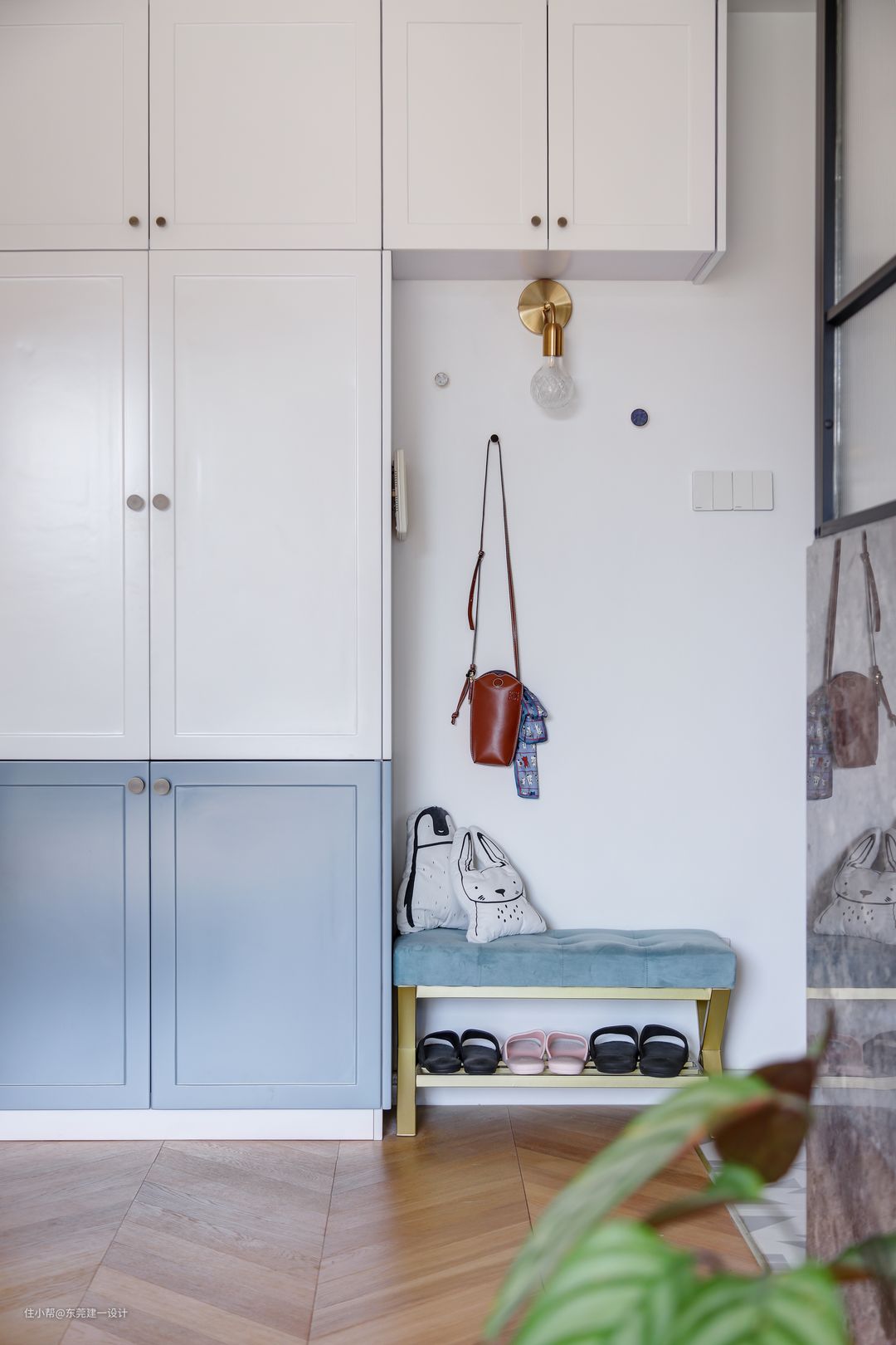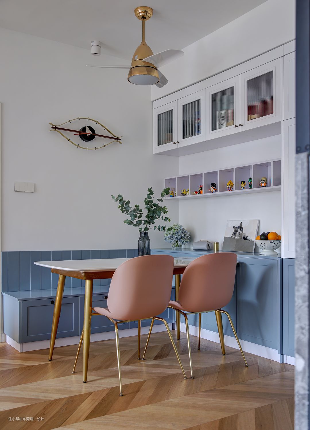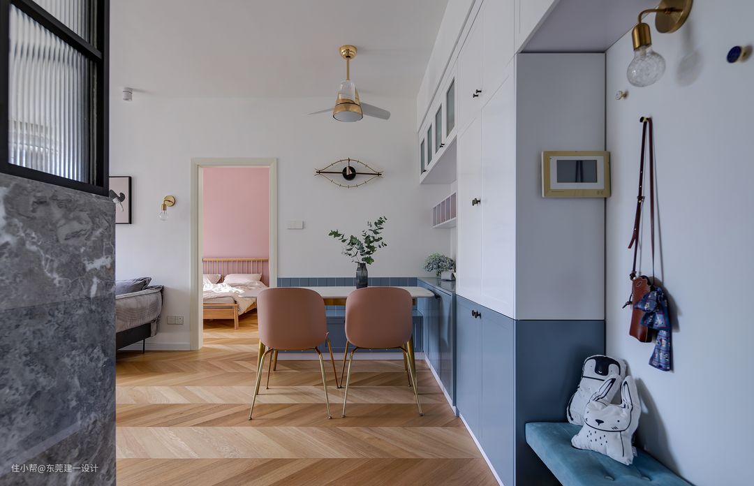 大门侧面玄关区是换鞋凳及鞋柜,跟着是餐边柜及餐厅,一体式设计的蓝色加白色柜体连同餐厅的卡座区,视觉整体感更好。