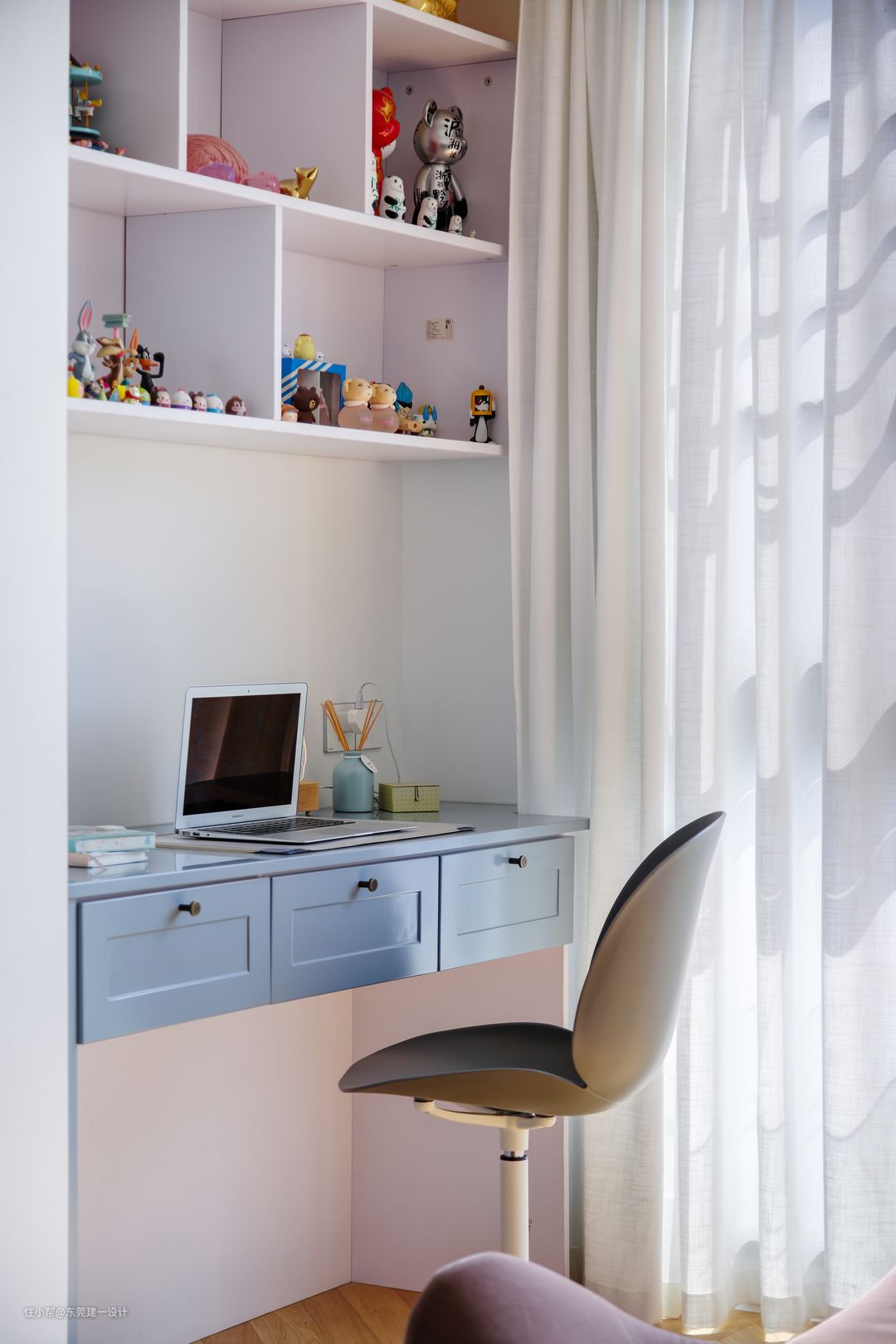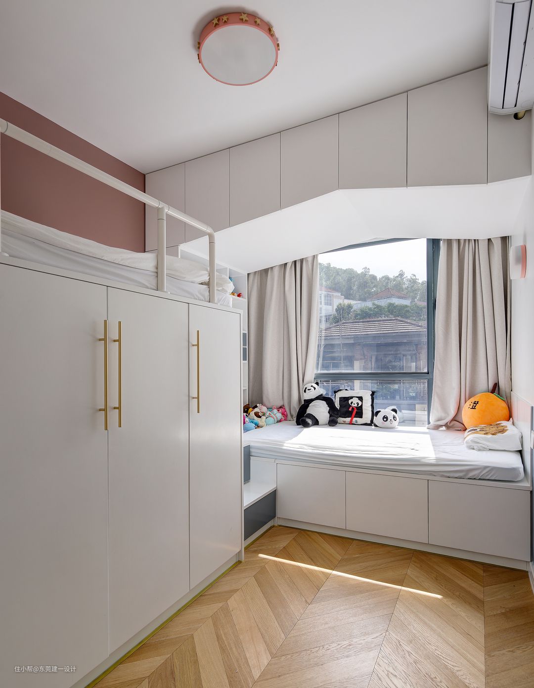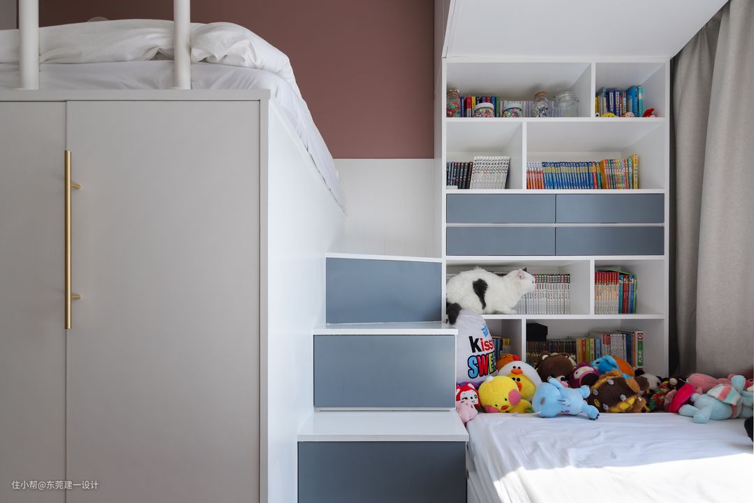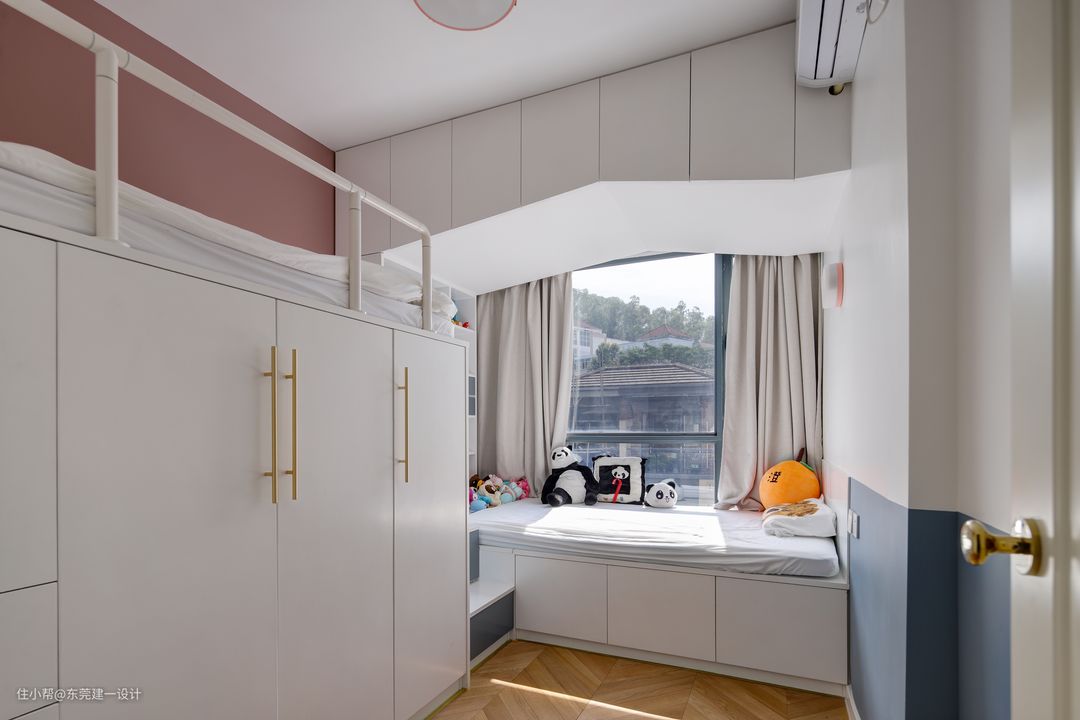 2个女儿的房间是此次设计的重点,在有限的空间里充分出2姐妹的独享空间,利用飘窗区域,把床架高,形成足够的储物空间。同时满足读书空间及玩具收纳区。