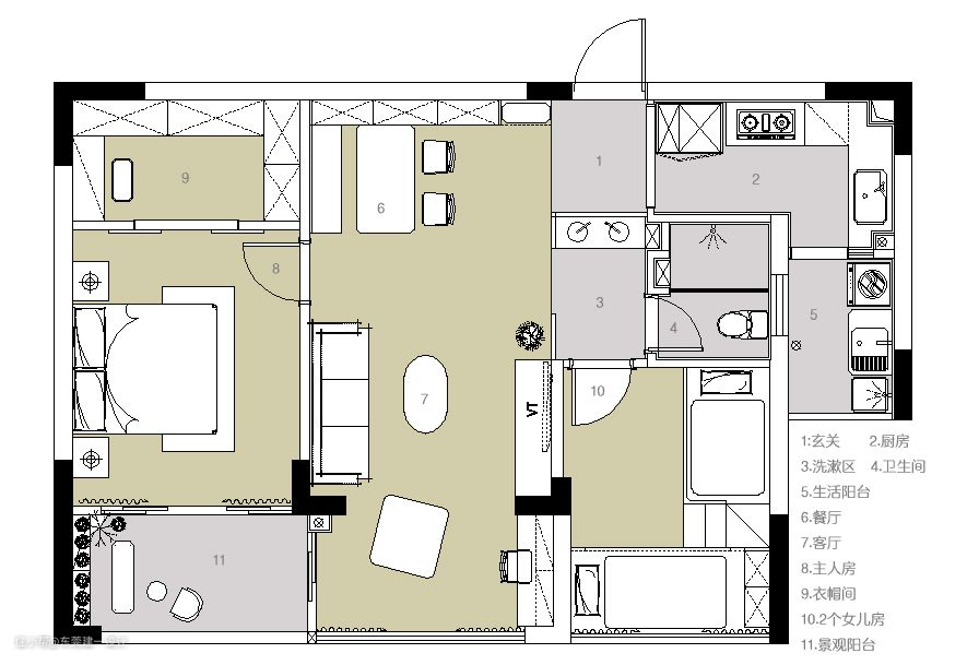 2,外放的洗漱区背面形成玄关区域,空间感更好,避免大门直冲卧室房门