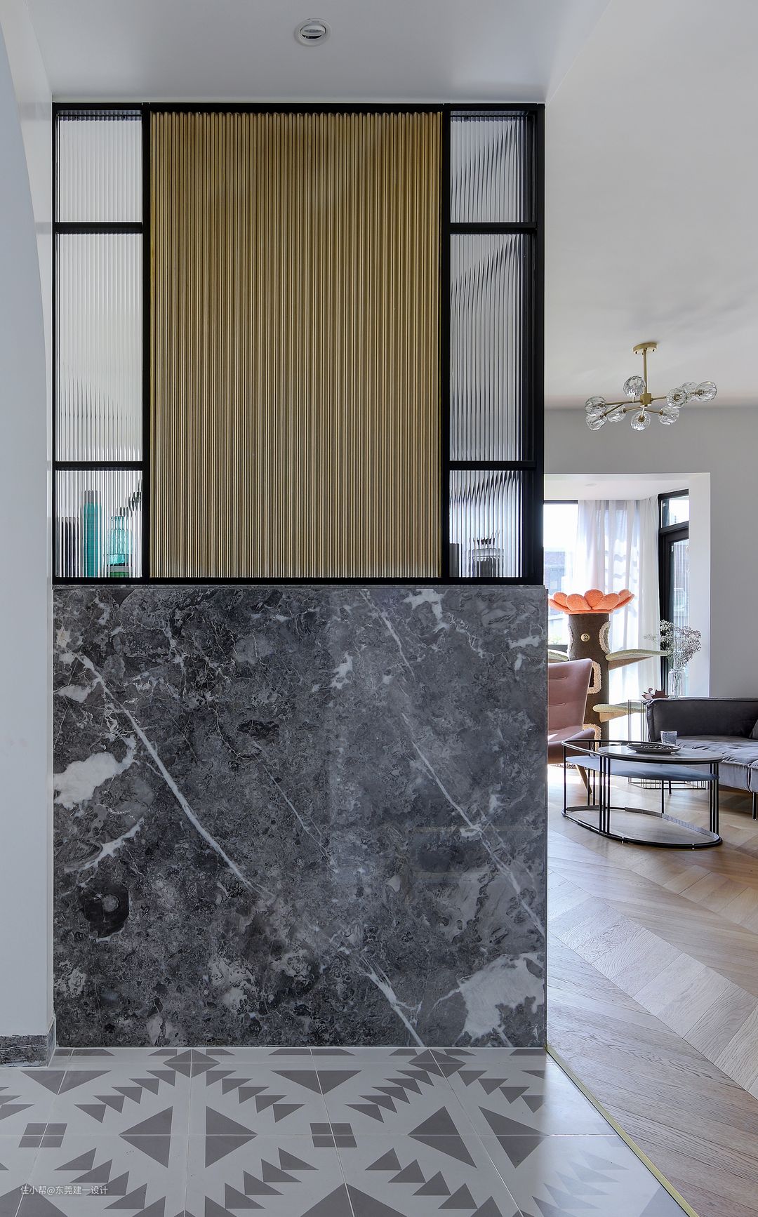玄关背面就是洗漱区,长虹玻璃的设计增加玄关区域的采光,也让空间更有光感。