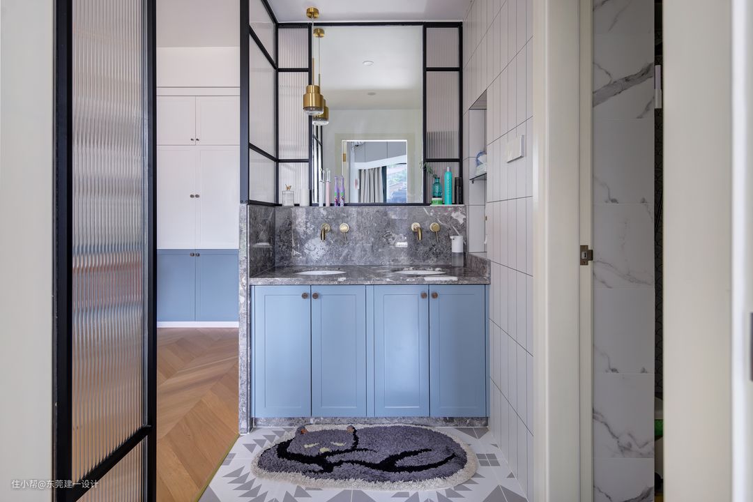 洗漱区延伸整体的蓝白设计色系,双台盆设计,以满足这个4口之家同时使用的方便
