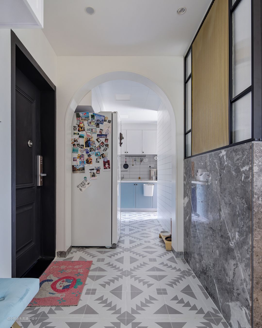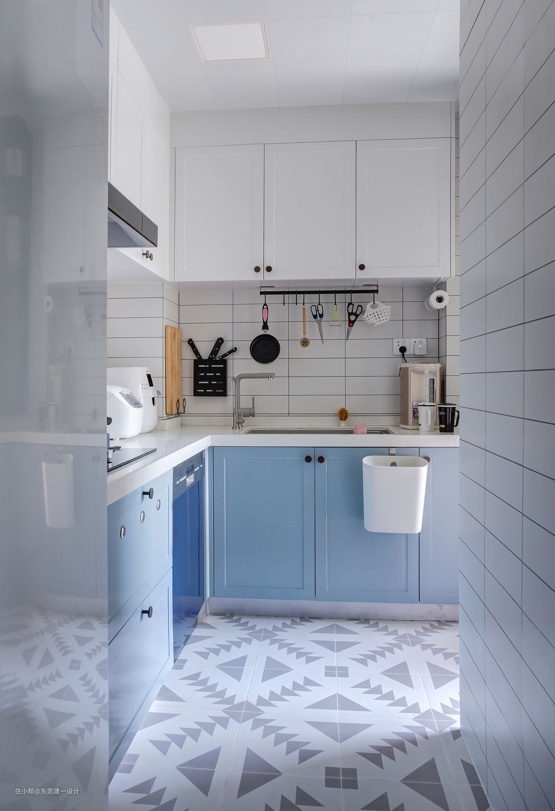 玄关侧面就是厨房区域了,通铺的灰白花砖连成一体,橱柜延续整体风格,用灰蓝加白色搭配