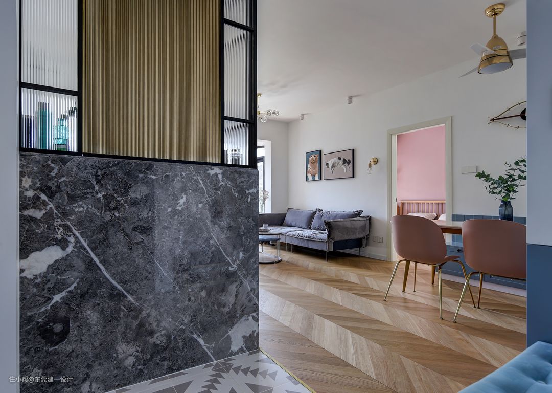 玄关区域看向餐厅客厅,地面材质利用洗漱区的长度形成分界线,玄关用砖,客厅餐厅用橡木地板。