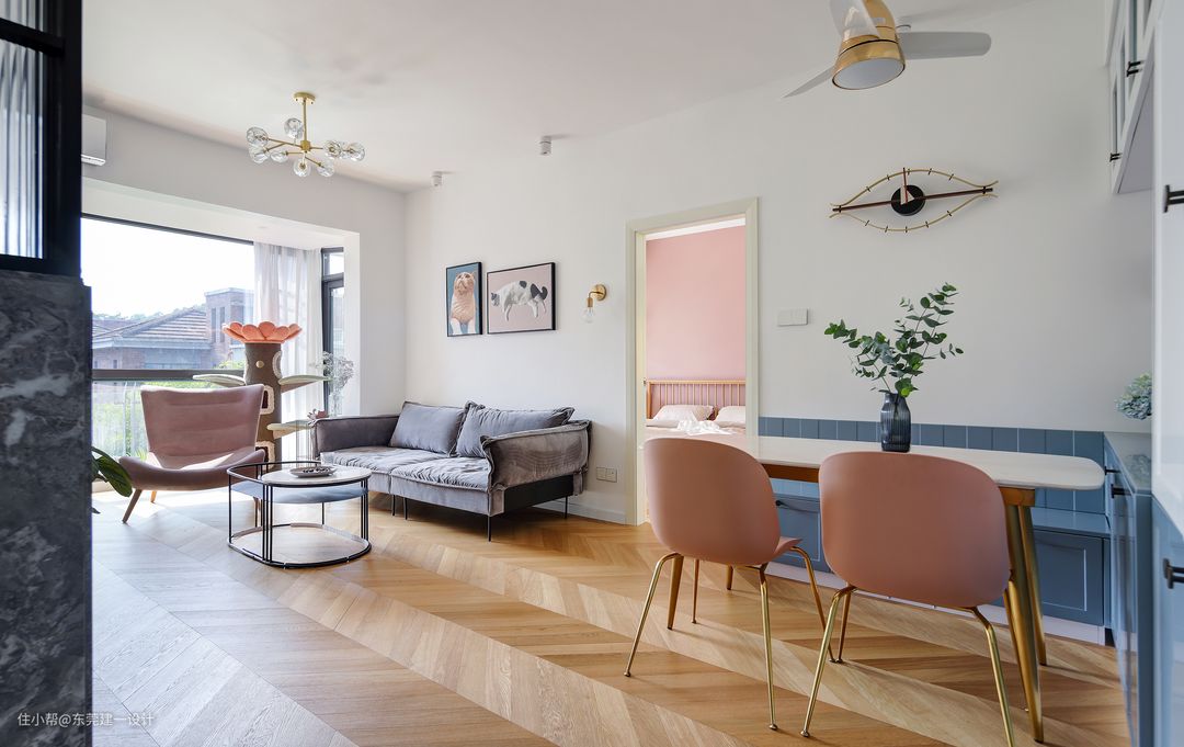 客厅 餐厅 全景,通铺的鱼骨拼橡木地板很吸睛,脚感也非常棒