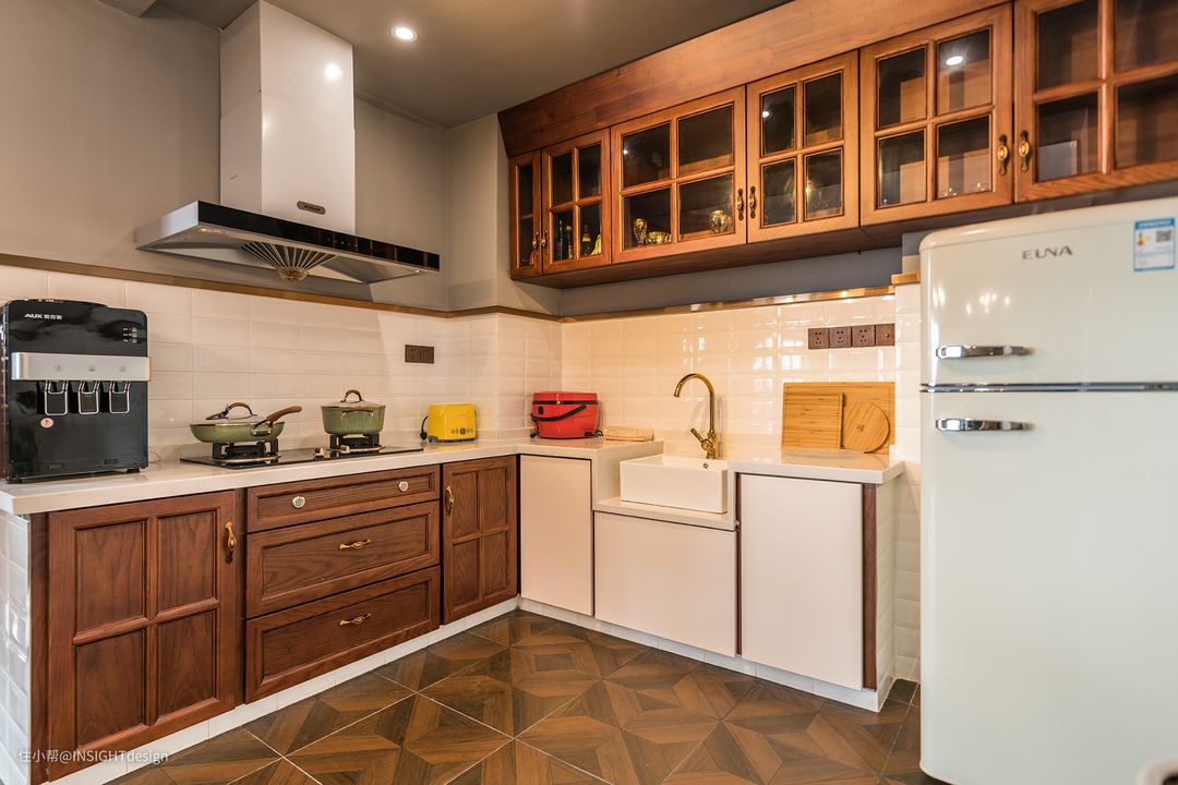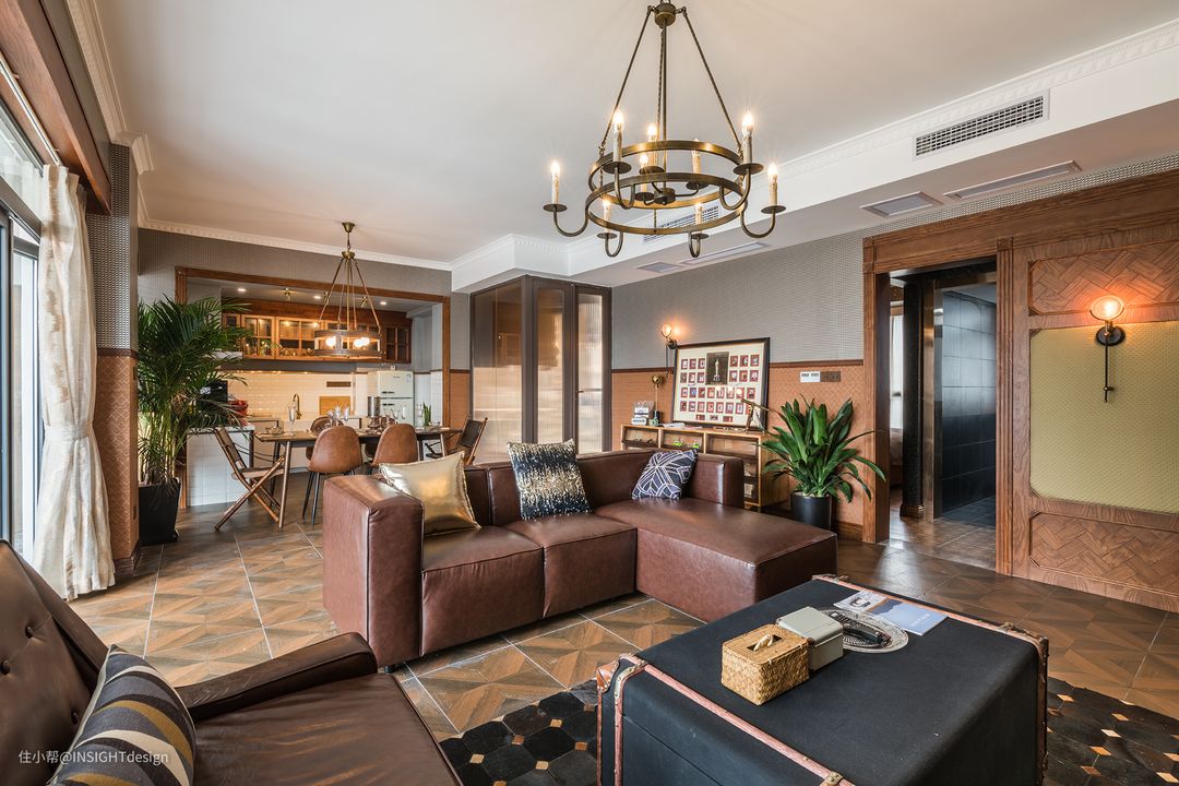 现在从客厅开始:客厅是做了偏港式的搭配定位,主要是色系,软装,陈列都有特意往这个方向靠拢。 这里说一下地面的情况,因为考虑港式效果,特意选了偏复古一系的地砖,因为造价的原因不能选择实木拼花木地板,强化木地板隐患比较多,一般水泥师傅的手艺不保证强化木地板的平整度,会有空壳的位置,后期热胀冷缩会引起返工,因此选用了砖面,值得高兴的是,现在能满足画面效果的材质都越来越好了,基本都能满足我们设计需求,所以用砖也是相当不错的考虑方向。避免麻烦。