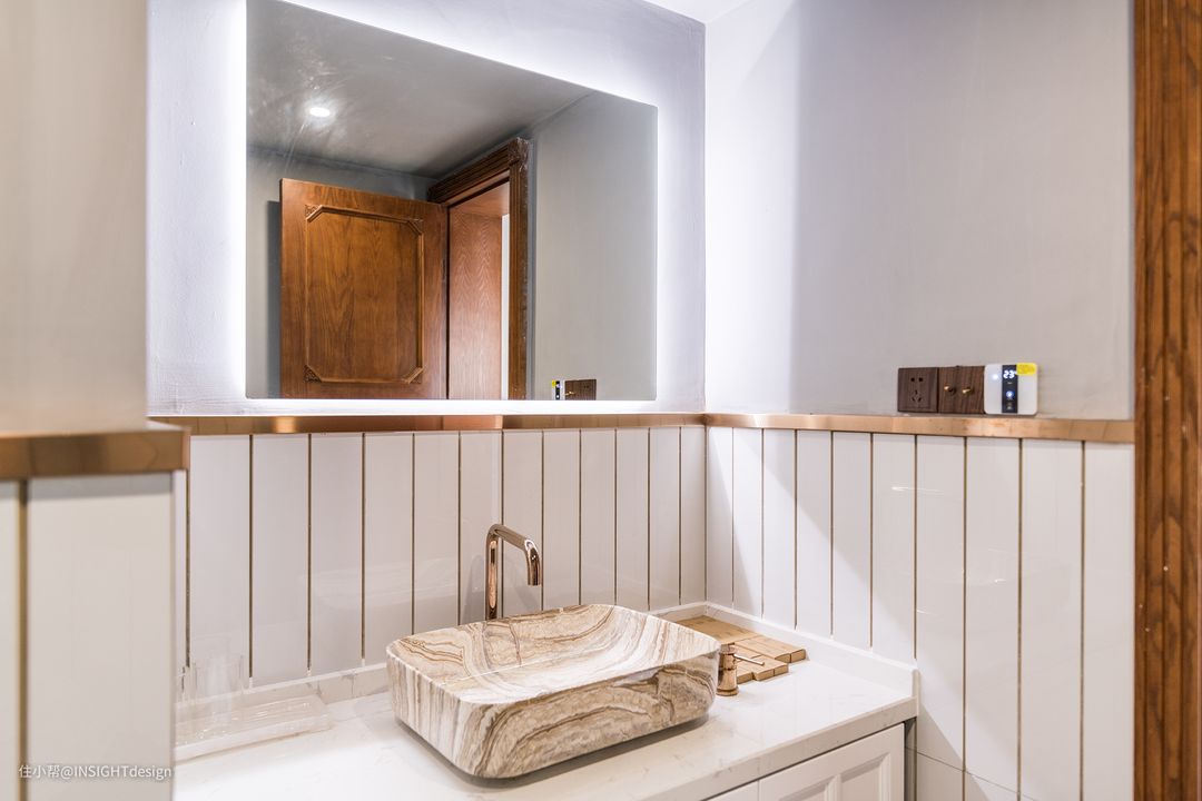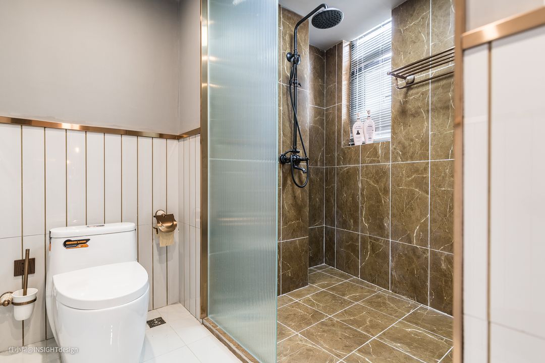 公共卫生间,做了三种拼接手法,质感漆,纯色砖和仿石材咖色砖