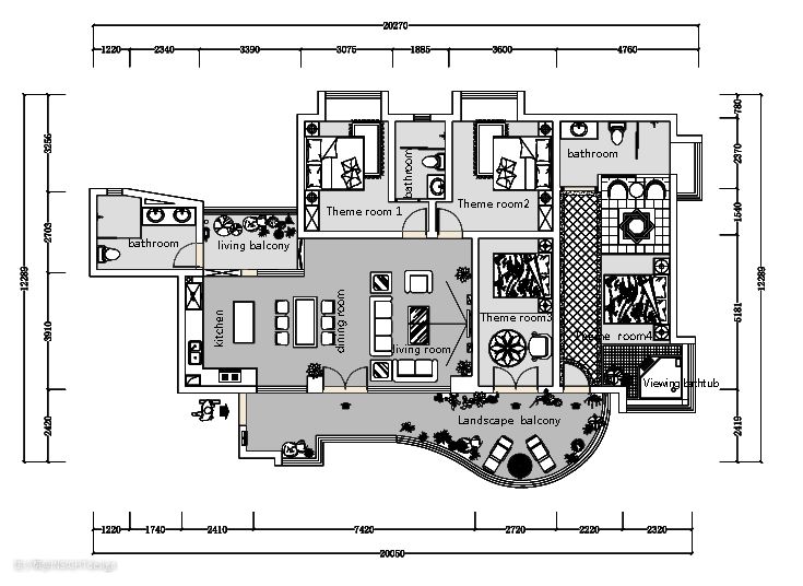 根据业主的意思,此房源仅作为休闲房使用,因此接下来进行的功能空间布置,有大胆,有保守,首先业主要求保留住完整的观景效果,因此阳台不允许封闭做其他功能,仅希望运用为观景阳台,其次不改变户型原始结构,那么设计师结合业主的想法,并且物尽所需,在保留了四房以及三个卫生间的功能需求的基础上,做了空间优化,客厅的改动主要是厨房,偏小不利于餐厅的布置,因此做了开放式处理,从而又能达到空间更宽敞的视觉。链接客厅的两个卧室仅是扩大了每一个房间的基本空间,把其中一个房间的门洞改了位置,让出过道放给了从阳台进入的小房间,作为休闲以及客房所用,主卧最大的房间做了一个突破的尝试,加入了靠窗浴缸,作为最大的惊喜🔲