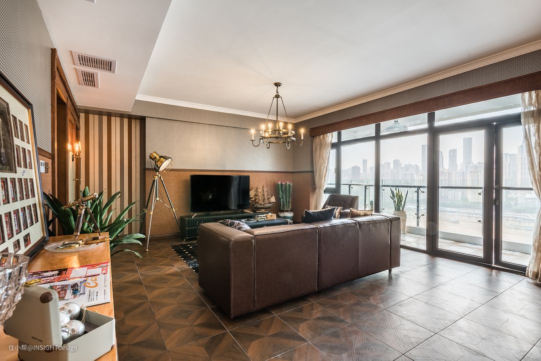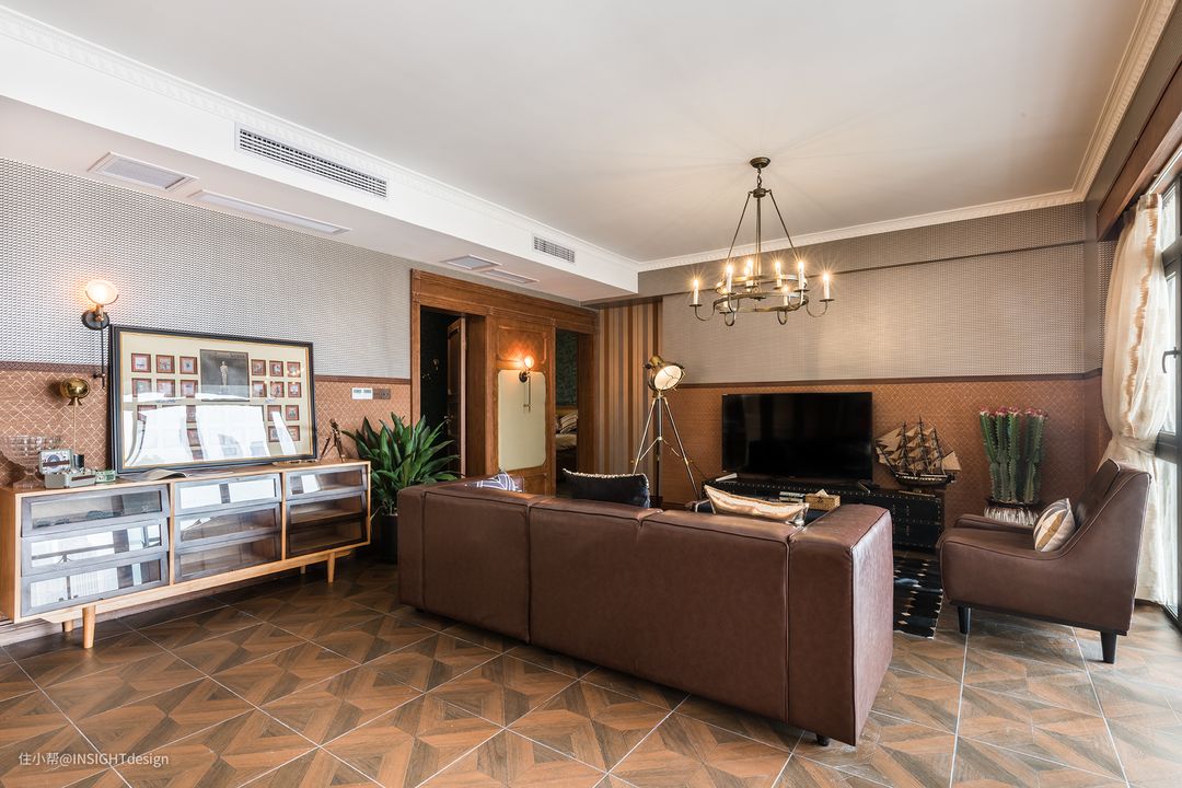 现在从客厅开始:客厅是做了偏港式的搭配定位,主要是色系,软装,陈列都有特意往这个方向靠拢。 这里说一下地面的情况,因为考虑港式效果,特意选了偏复古一系的地砖,因为造价的原因不能选择实木拼花木地板,强化木地板隐患比较多,一般水泥师傅的手艺不保证强化木地板的平整度,会有空壳的位置,后期热胀冷缩会引起返工,因此选用了砖面,值得高兴的是,现在能满足画面效果的材质都越来越好了,基本都能满足我们设计需求,所以用砖也是相当不错的考虑方向。避免麻烦。