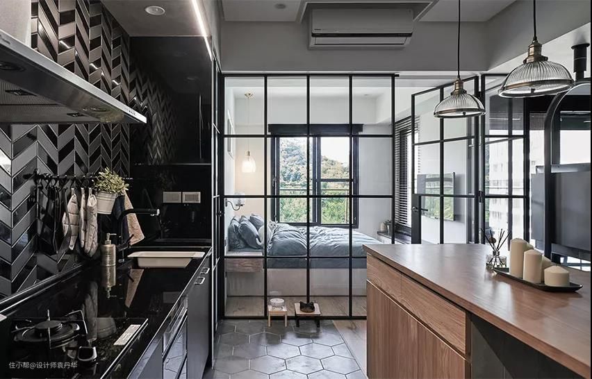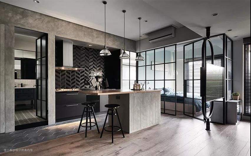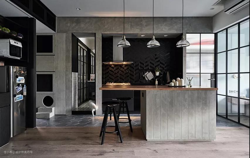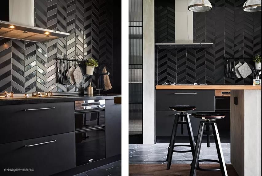 考虑到家中只有夫妇两人居住,便舍去独立餐厅,吧台就是用餐区,搭配时尚的吊顶灯,即使是黑色系的厨房,也有温情。