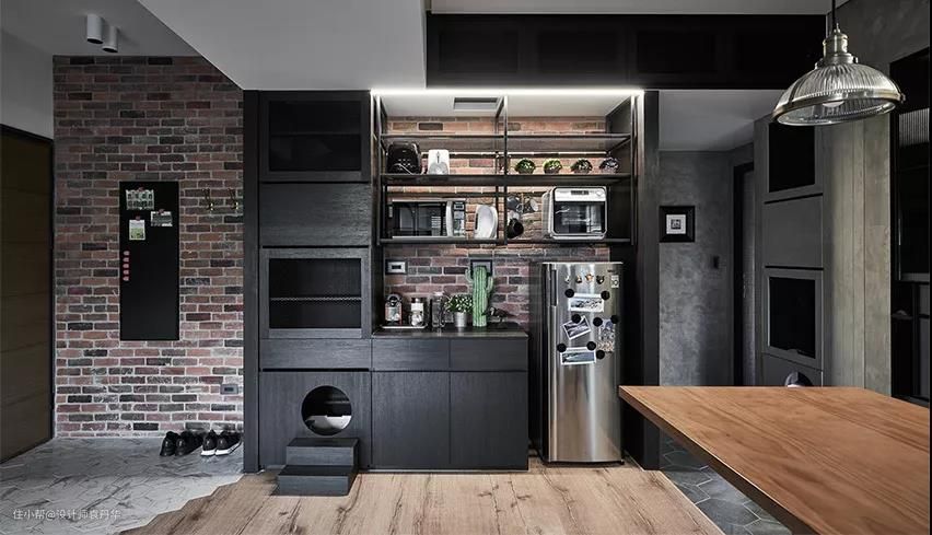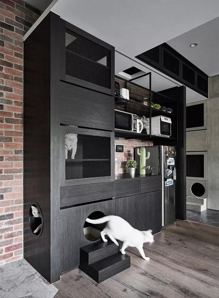 红砖墙与黑色柜子奠定了整个房间的复古感,门口的半开放式橱柜既是橱柜也是猫咪的活动区,它们从这里进入,可以直通天花板的通道。