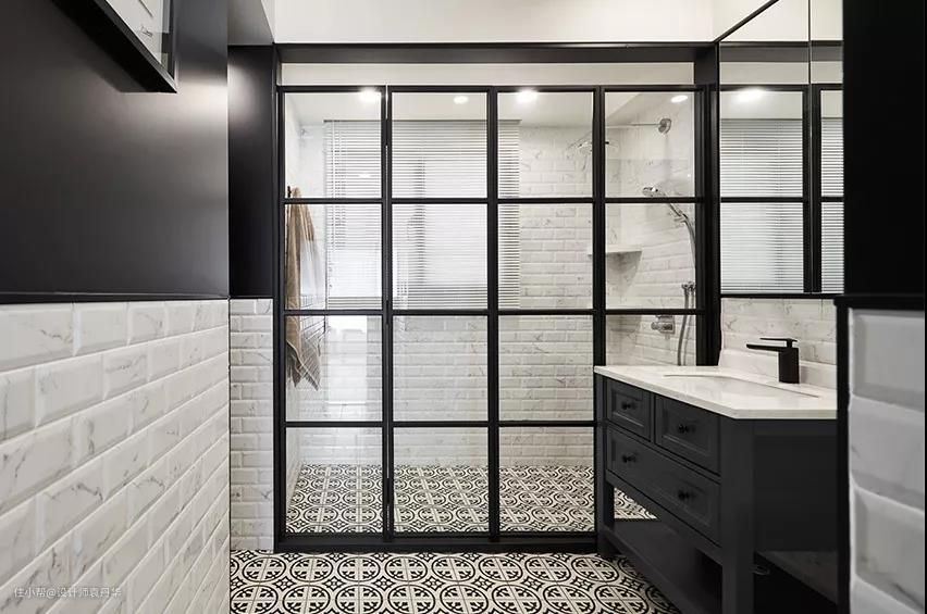 淋浴房也选用了黑色边框的玻璃门做干湿分离,与家具风格一致,但低头一看会发现地上铺的是花砖,墙面铺的是白色的地铁砖,整个卫生间简洁而不失活泼。