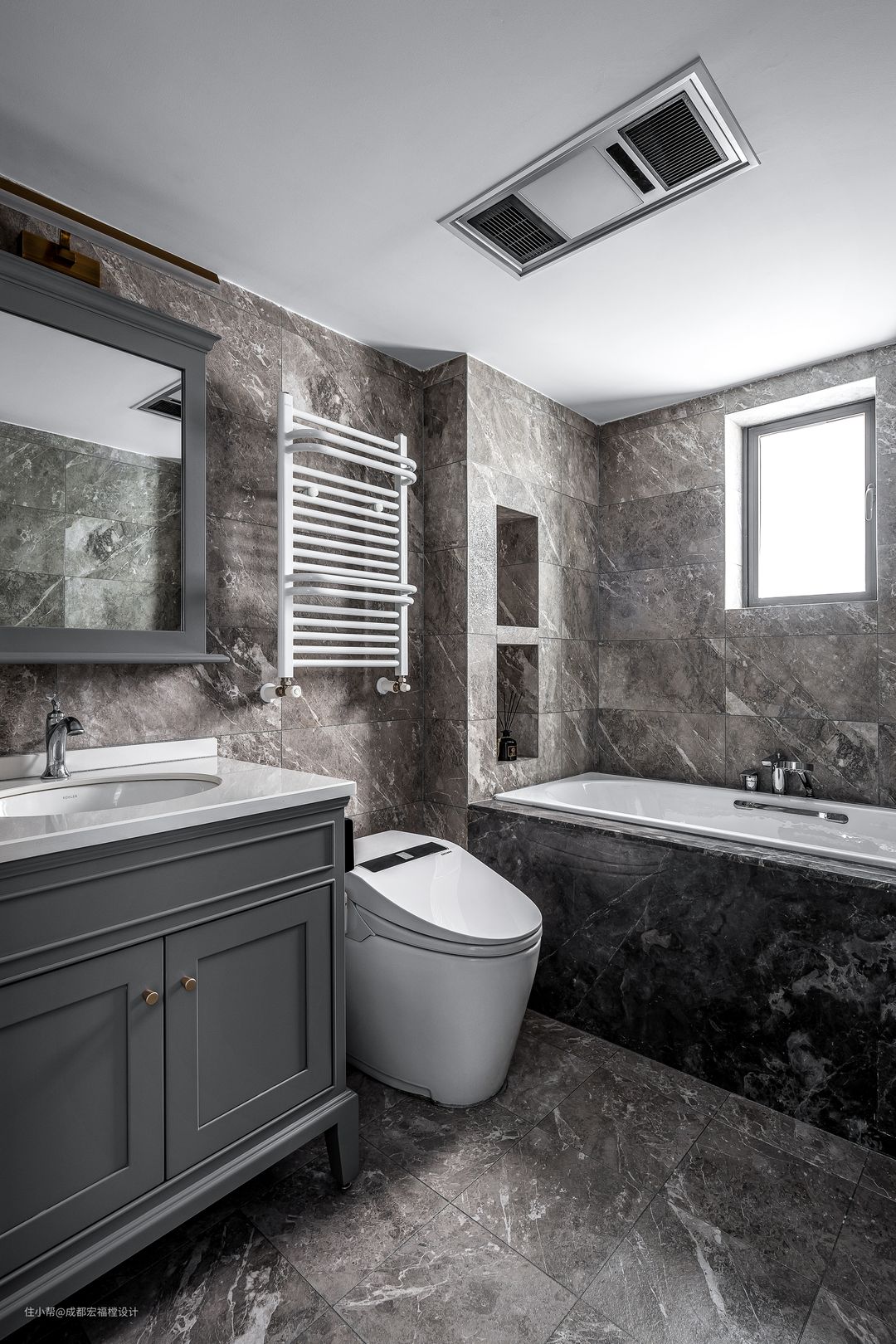 深灰与意大利浅灰大理石瓷砖的铺贴缔造了家里最后一个私人空间的完美性。幸福是早晨被阳光唤醒起床刷牙的时候,也是当身体沉入温暖的水浴中被带走一身疲惫的时候。#宏福樘 #春之物语 #卫生间 #浴缸 #浴室柜 #马桶