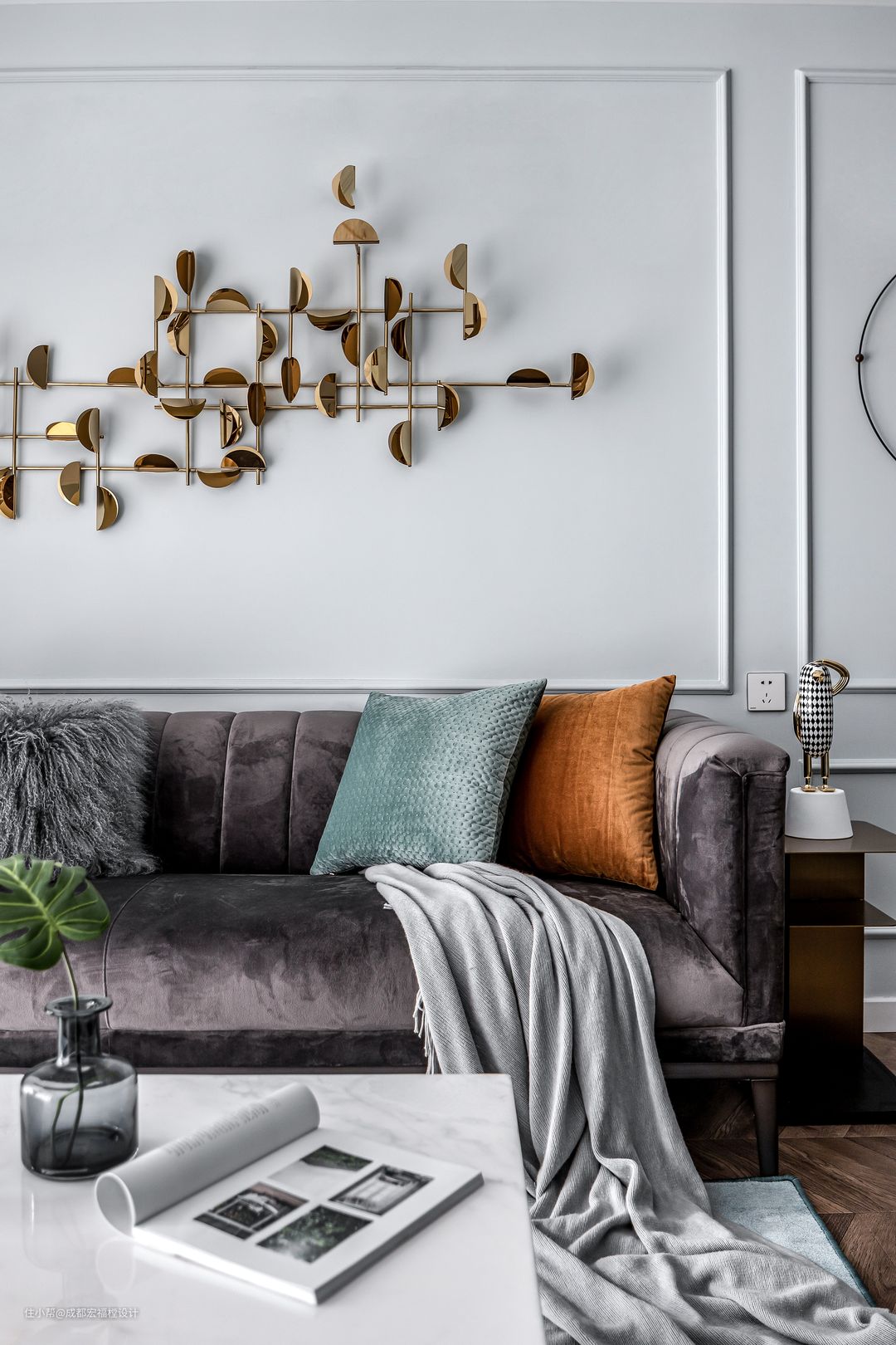 灰色空间往往会让屋主觉得家里过于冷淡,所以在软装阶段以温暖的丝绒材质作为主体搭配。#宏福樘 #春之物语 #客厅 #沙发 #茶几 #软装