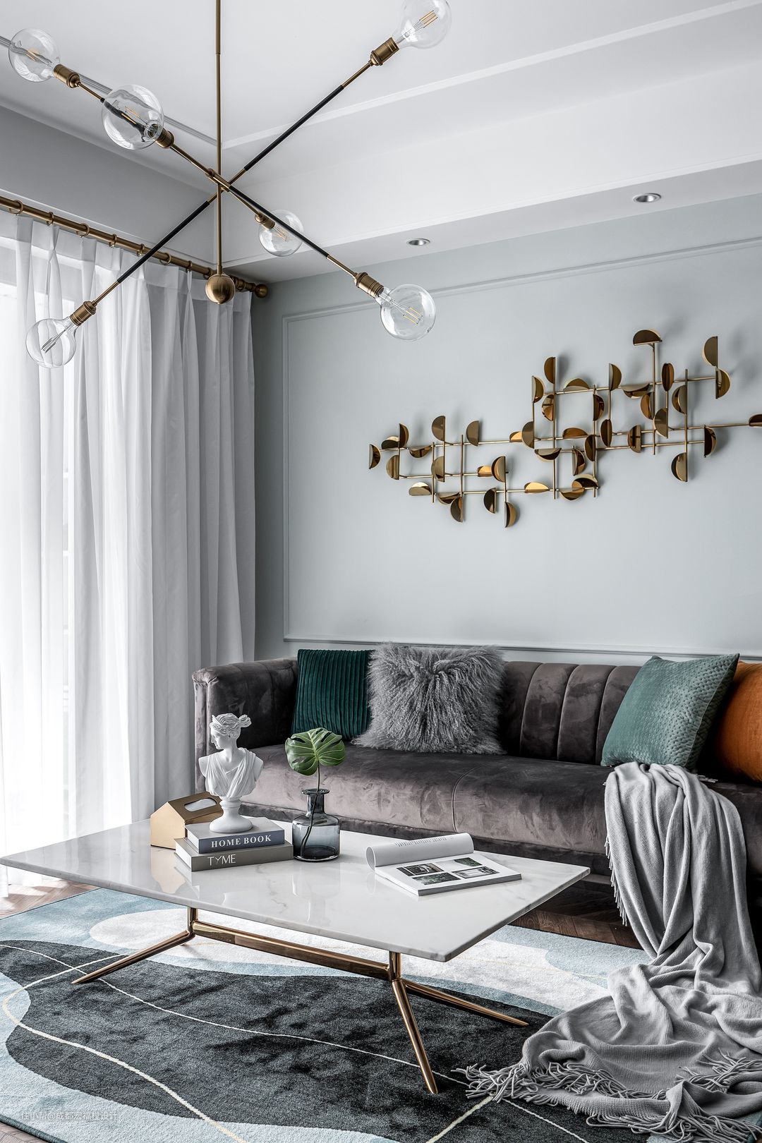 灰色空间往往会让屋主觉得家里过于冷淡,所以在软装阶段以温暖的丝绒材质作为主体搭配。#宏福樘 #春之物语 #客厅 #沙发 #茶几 #软装