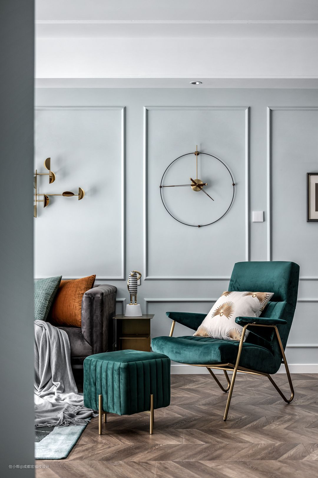 复古鱼骨拼搭配墨绿丝绒质感单人椅无疑是提升室内格调的表达方式之一。#宏福樘 #春之物语 #客厅 #沙发 #茶几 #软装