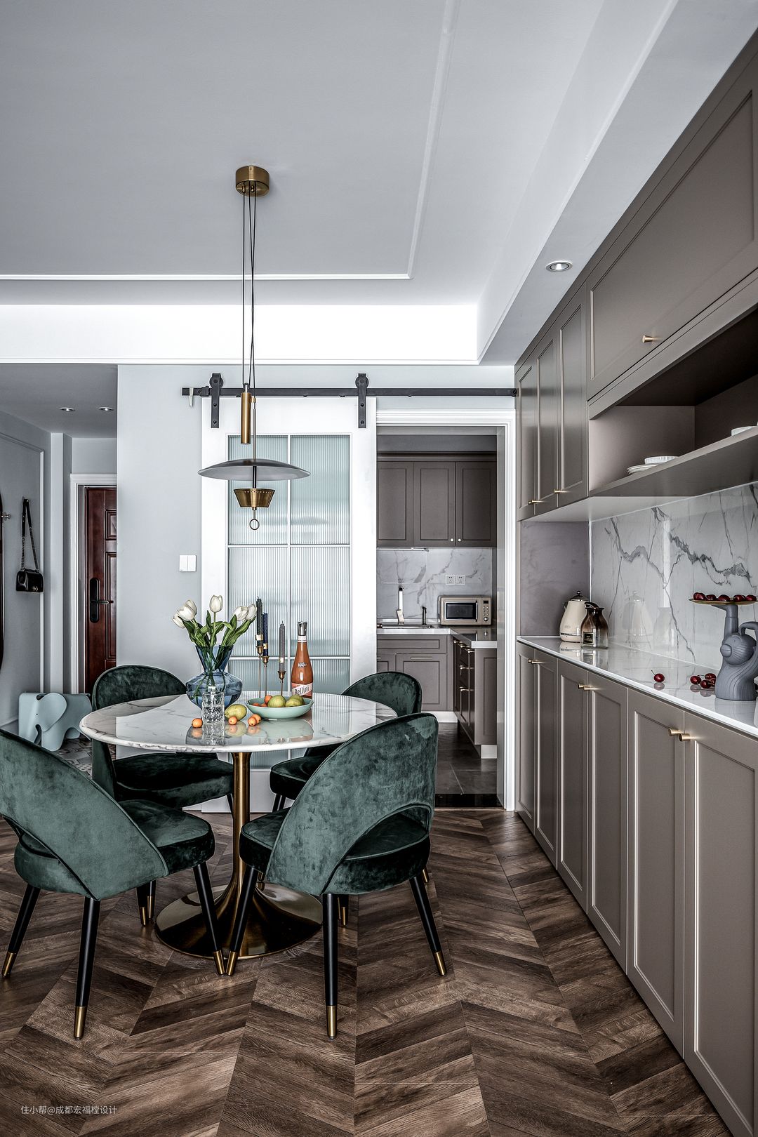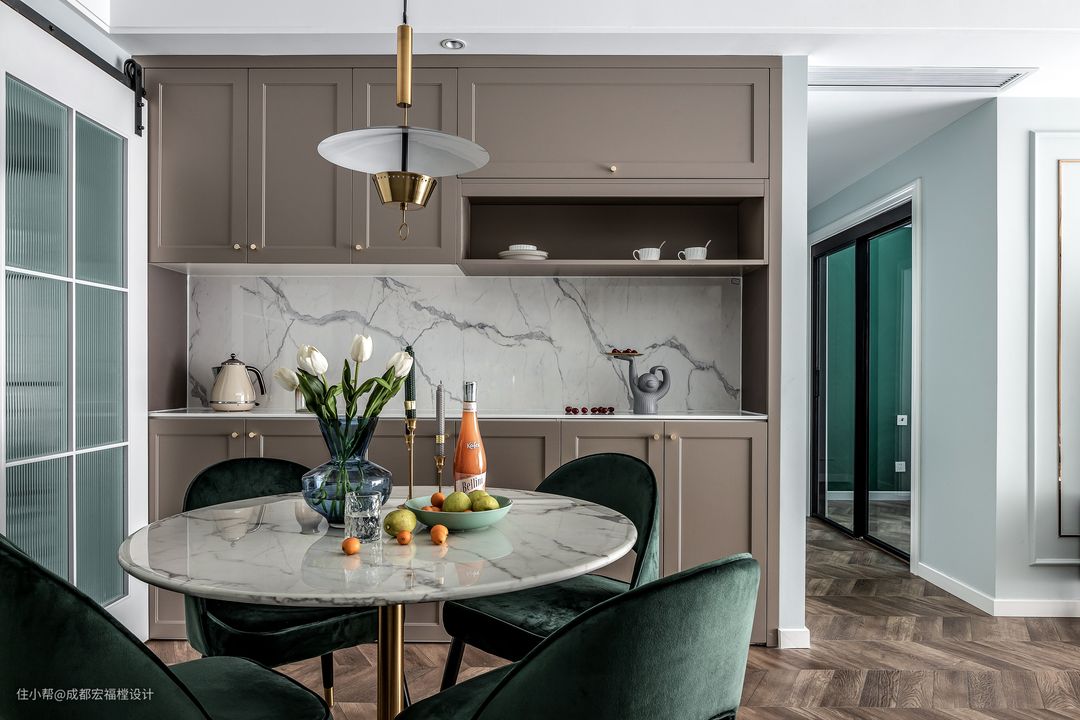 墨绿丝绒餐椅搭配简约金属吊灯在与客厅氛围相融合,也以轻奢感塑造了每天的用餐仪式感。#宏福樘 #春之物语 #餐厅