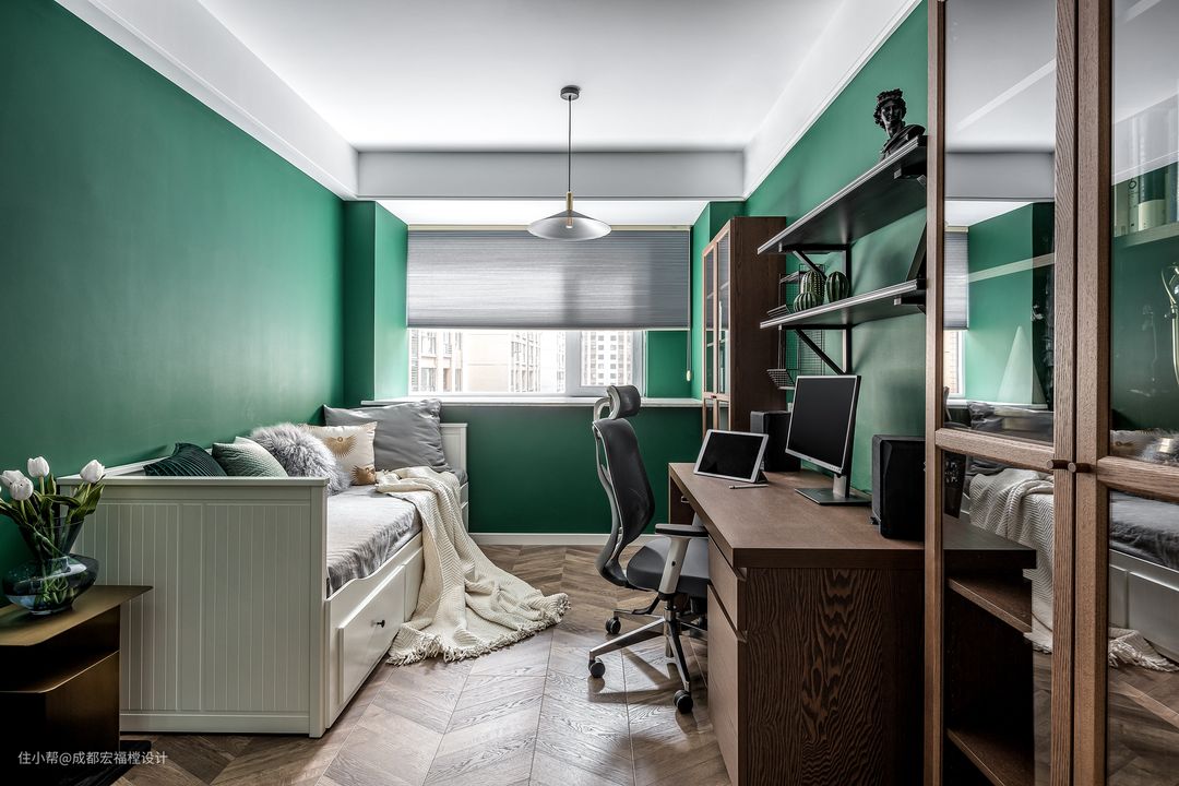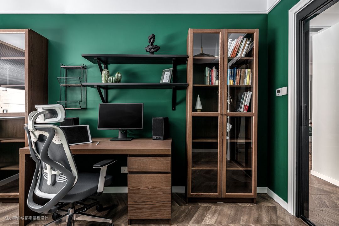 书房使用屋主喜爱的墨绿色,去掉金属元素改用原木色书柜搭配也让整个环境仿佛置身于清新的大自然中。#宏福樘 #春之物语 #书房 #书柜 #书桌
