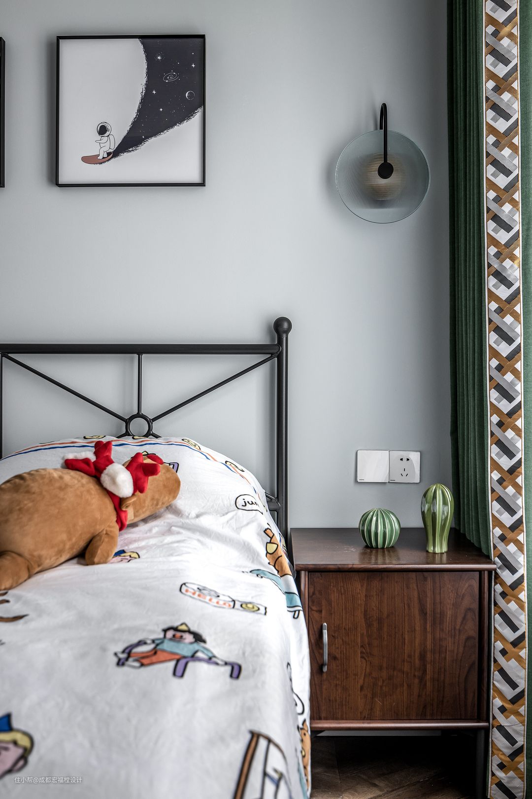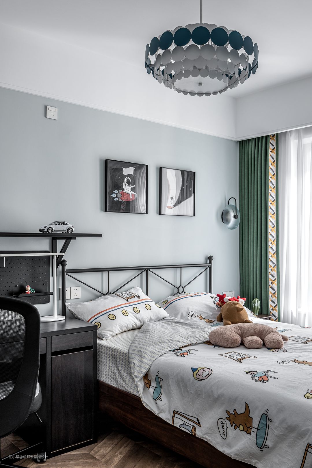 儿童房太空人的挂画,黑色的铁艺床,让整个房间保留童趣又不失小男子汉的硬朗感。#宏福樘 #春之物语 #卧室 #儿童房 #床 #衣柜