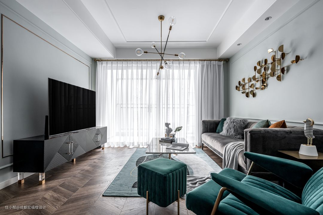 交错的设计感主灯的使用丰富了客厅的层次感,半透明窗纱让阳光能够更好的穿透到室内,使空间明亮通透。#宏福樘 #春之物语 #客厅 #沙发 #电视柜 #灯具 #瓷砖