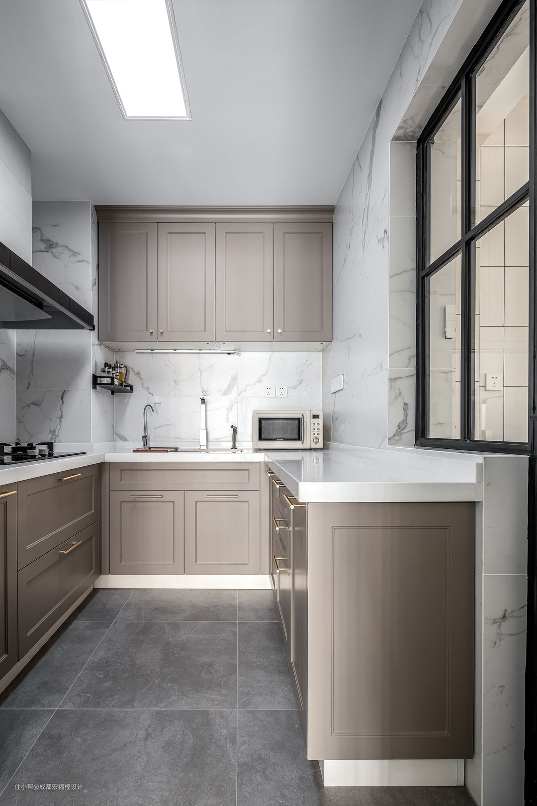 中厨与备餐台格相互融合呼应,灰咖色搭配大理石贴砖,身在倍感舒适与放松的空间里,做出的饭菜也必定可口美味。#宏福樘 #春之物语 #厨房 #橱柜
