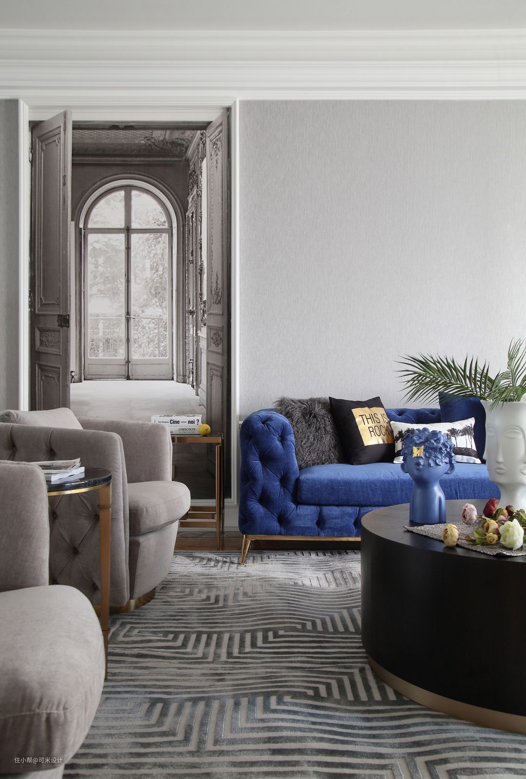 客厅另一侧摆放了灰色与金色结合的条凳,时尚轻盈。地面的灰色条纹地毯色彩丰盈生动,使得整屋更显精致感。