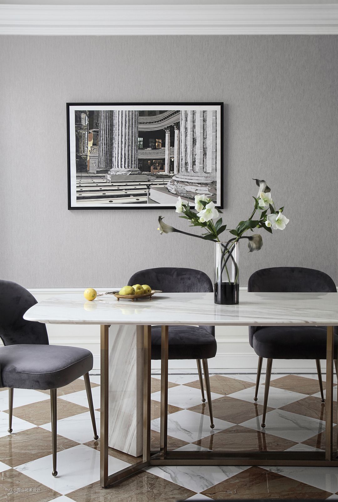 轻盈的白色桌面配上华丽的金色桌腿,餐桌整体显得深邃而空灵。餐椅的造型大气而挺括,与餐桌搭配在一起营造出一种大气而雅致的氛围。墙上的复古挂画又为空间增添了一份艺术气息。