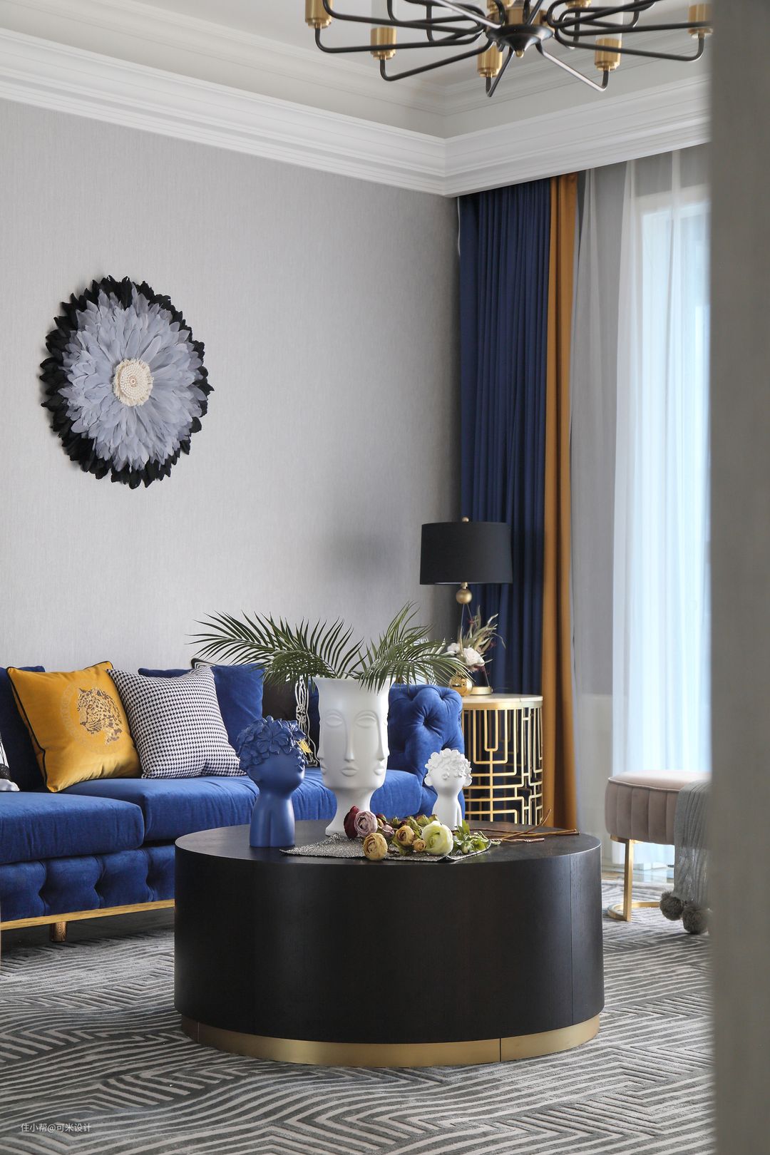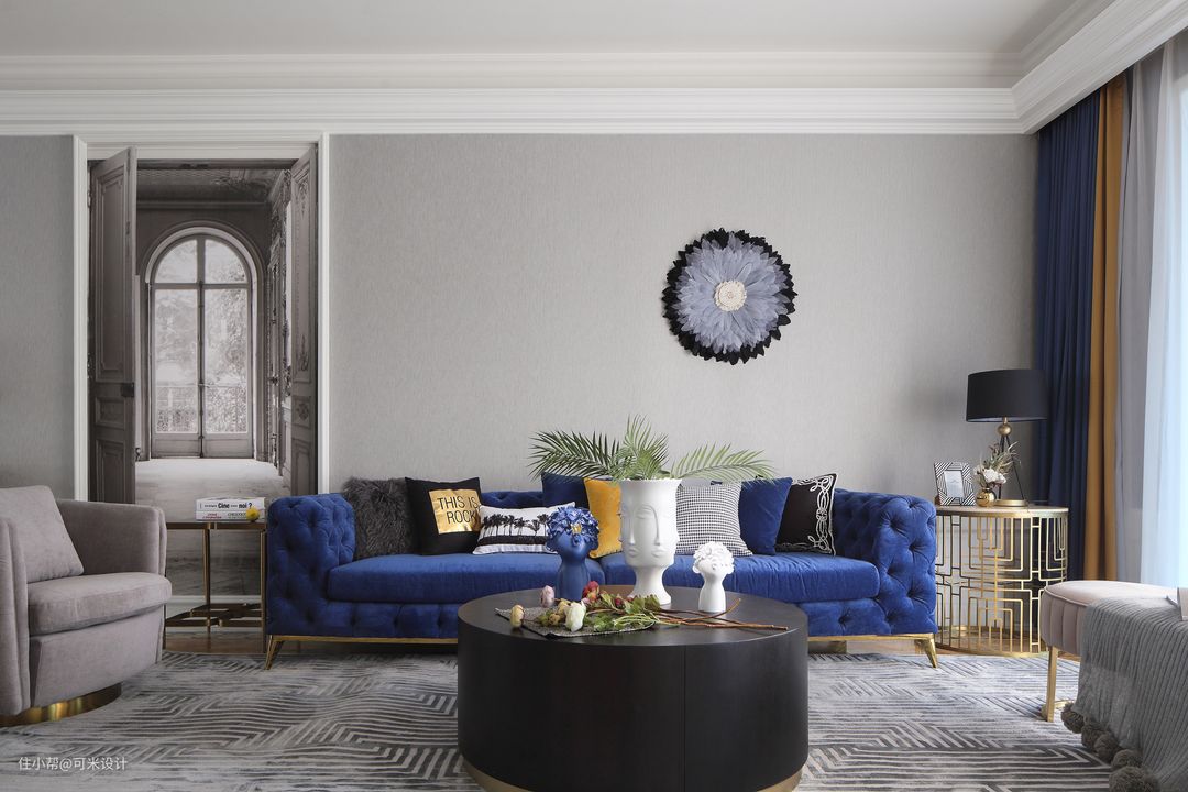 黑色与金色组合的圆形茶几,既高级又优雅。茶几上的多面花瓶与人物摆件造型灵动,给空间带来一股强烈的艺术气息。