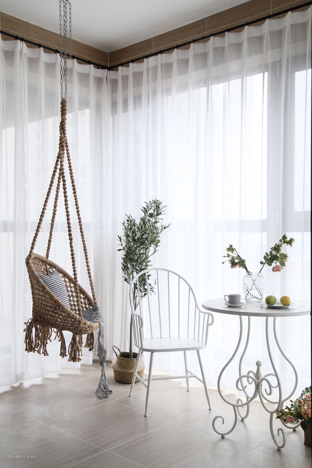 阳台的三面都是无遮挡的落地窗,在光线与纱帘的双重作用下营造出了轻松、贴近自然的氛围。这里作为休闲、娱乐的功能区,闲暇时坐在此处泡上一杯咖啡,静静地看着窗外的景致,思绪一下就放松了许多;当孩子们在这里嬉戏一番,一下就充满了生活该有的味道。