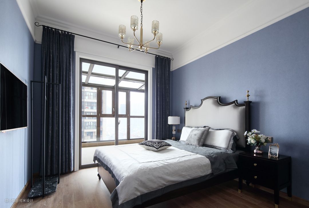 父母房间的墙面满贴了蓝灰色的墙布,充满时尚美感,又显得慵懒而惬意;搭配上黑色的家具,使得空间看起来更显高级与庄重。窗帘选购了深蓝色搭配碎花的款式,拉上之后可以营造出一种静谧的环境,有助于睡眠。拉开门就是阳台,静伫窗前,携一缕清风,续一杯清茶,邀一轮明月,远离城市的喧嚣,静静地享受属于自己的那份恬静。
