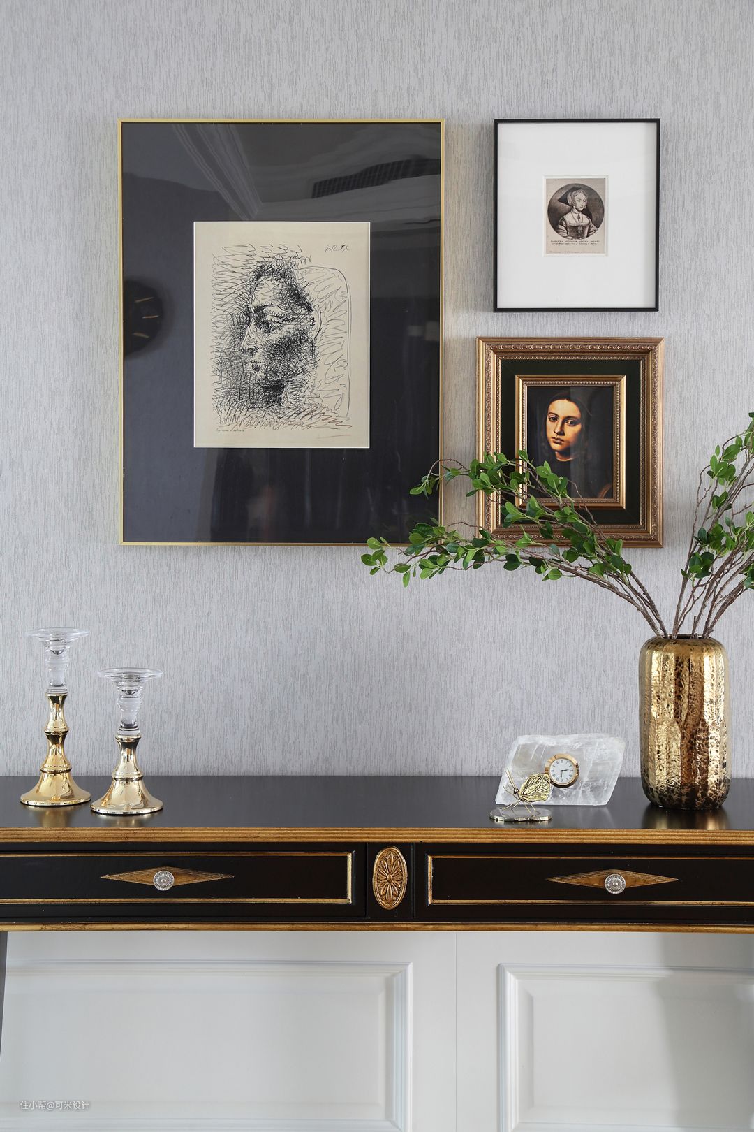 黑色的装饰柜上点缀一些金色,增添了空间的优雅与时髦感。简单的插花布置可以给居室带来轻盈的平衡杆,让屋主卸下一天的疲惫。透明的晶石座钟,造型唯美;复古装饰画的点缀,可以提升空间的气质与精致感。