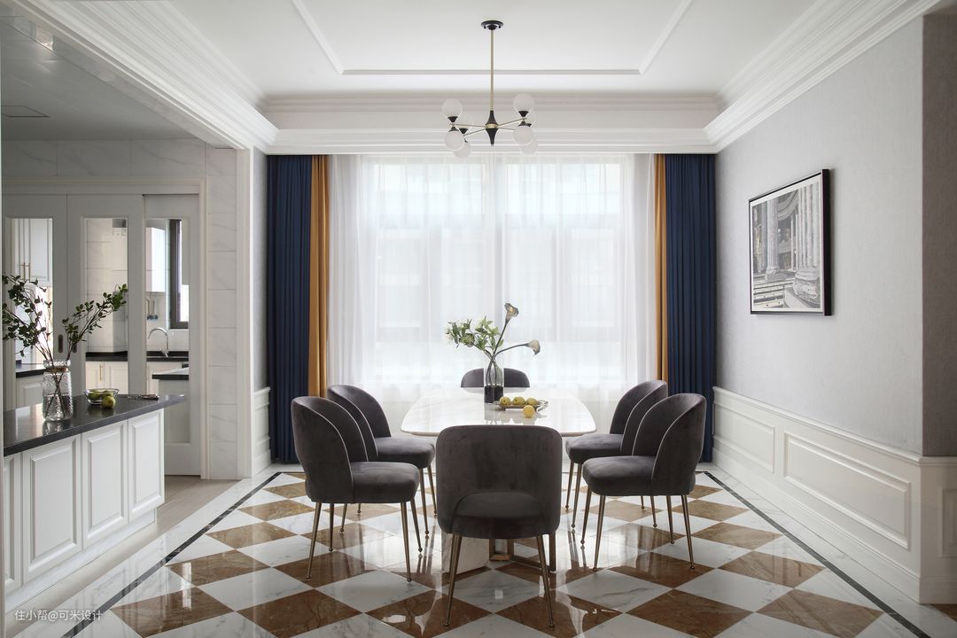客厅与餐厅之间通过吊顶将其分隔开来,墙面都定制了白色的半截护墙板,与电视墙的白色相呼应,同时又提升了整屋的格调与档次。