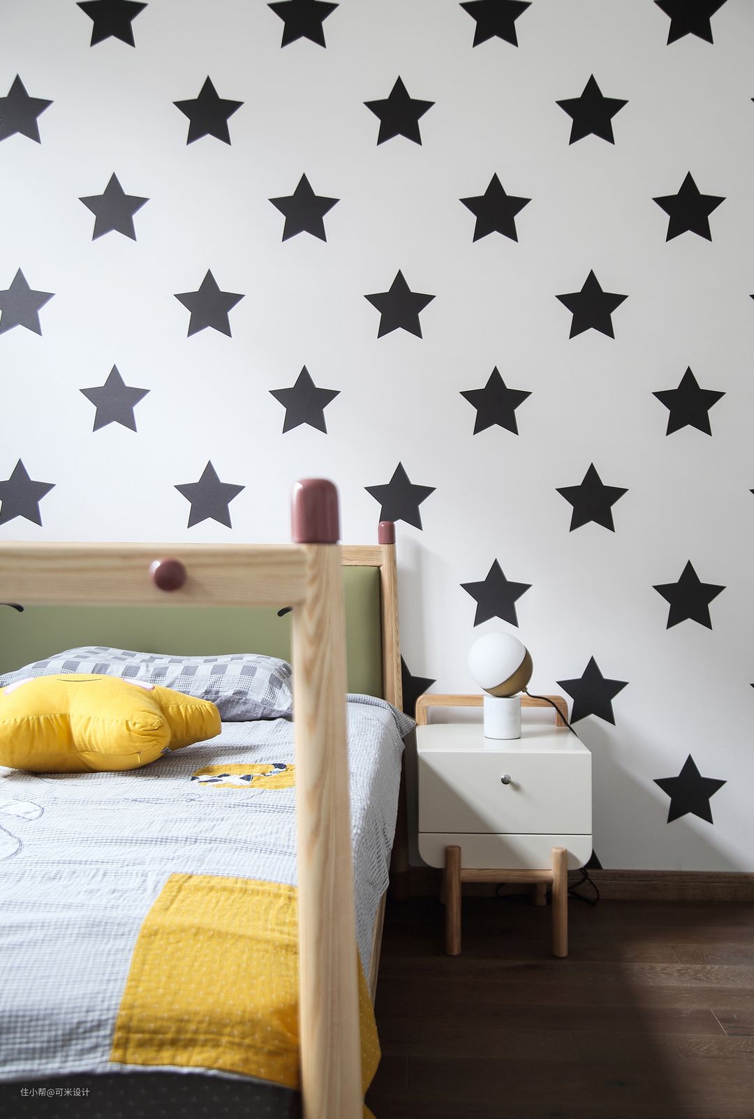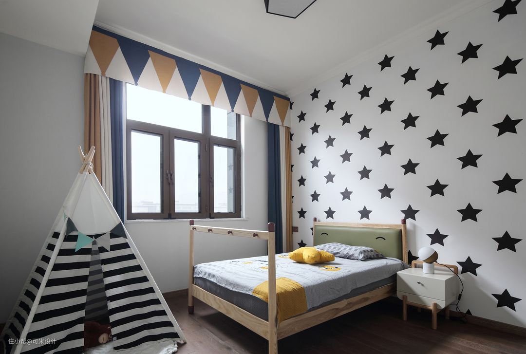 小儿子的房间墙面以白色为主,点缀一些五角星,看起来清爽又不失童趣。床和床头柜的高度都比我们正常的矮小一些,由于孩子还在上幼儿园,这样对于他自己来说实用性更方便,也有助于锻炼他自己收纳一些小物件。一个小小的帐篷,不仅可以给孩子创造一个独立的小空间,还可以丰富他的心灵,尽情的挥洒自己的创意与想象。