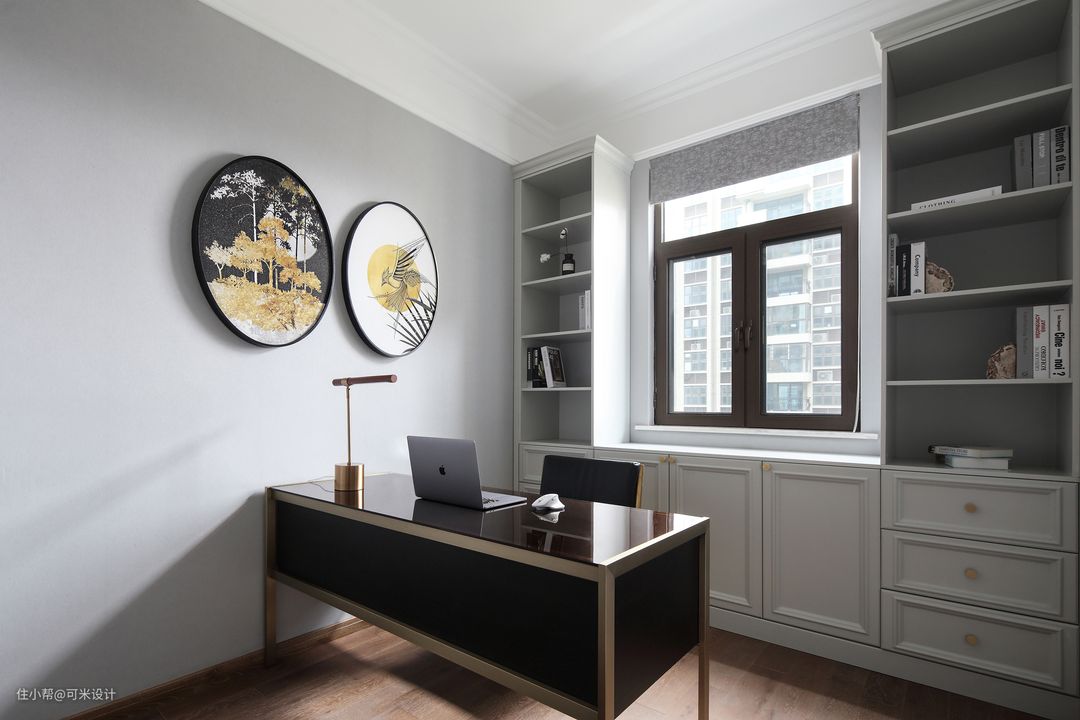 书房的墙面以浅灰为主,柜子也是定制的浅灰色,可以提升整个空间的高级感。墙面上点缀两幅带有中国风色彩的圆形挂画,营造出一份清静的工作与学习氛围。