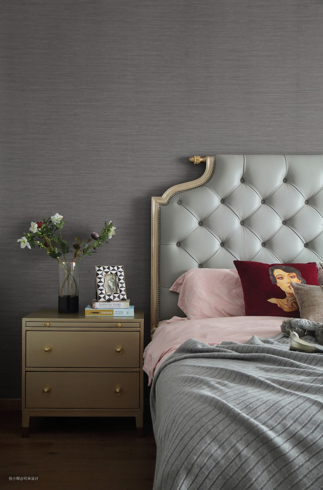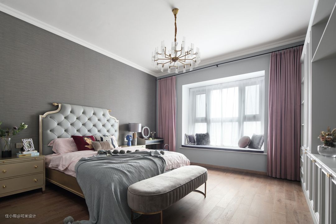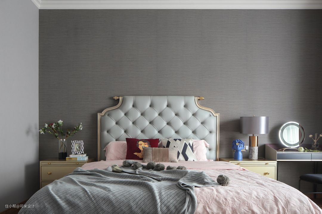 主卧的床头背景贴了深灰色的墙布,与其他墙面的浅灰形成对比,更加突显出深灰色的床头。软包与实木完美结合的床背,营造舒适感的同时又暗含品位与优雅;搭配上浅粉色的床品,给整个房间带来一份温润而浪漫的气息。