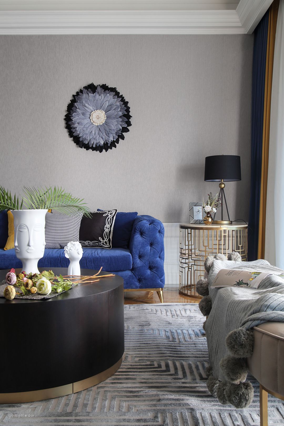客厅另一侧摆放了灰色与金色结合的条凳,时尚轻盈。地面的灰色条纹地毯色彩丰盈生动,使得整屋更显精致感。