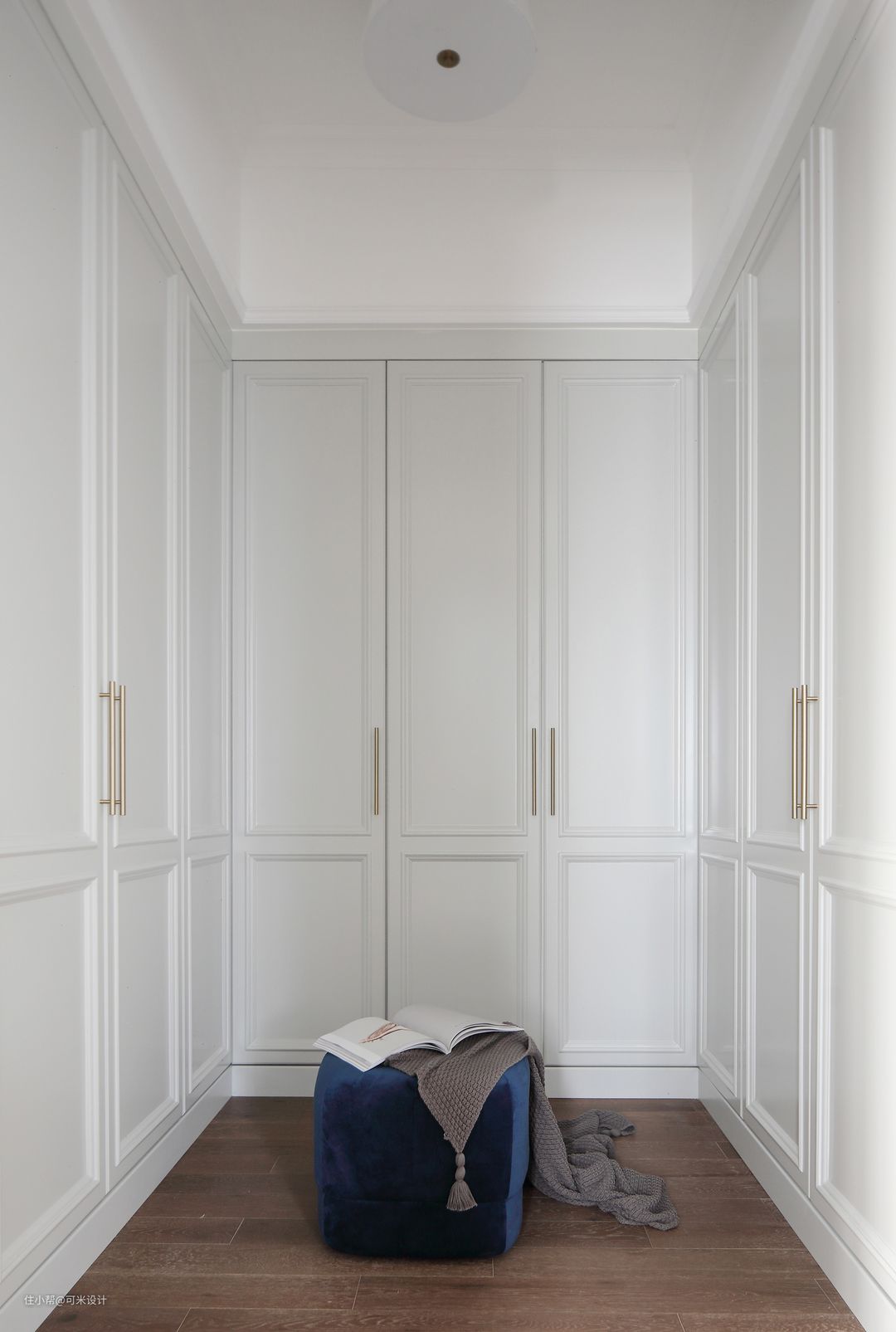 主卧有一个独立的衣帽间,储物空间非常大,不仅承担收纳衣物的重则,还是许多女孩梦寐以求的一片小天地。中间放上一个蓝色的小坐墩,可以坐在这里悠闲的挑选喜爱的衣物,也增加了空间的时髦感。白色的柜子与整屋色调相统一,搭上金色的拉手,使得整体精致感十足。