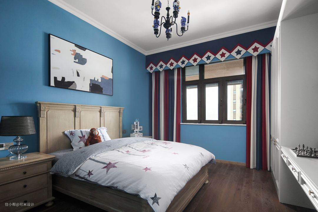 大儿子的房间用蓝色的墙布贴满墙面,象征着大海、蓝天,很适合男孩子的房间;点缀一幅拼色的抽象挂画,再搭上浅色木纹的家具,整个空间显得舒适自然,使得心情更加舒畅。红蓝白三色组合而成的窗帘,五角星的床品,给房间带来了满满的童真感。