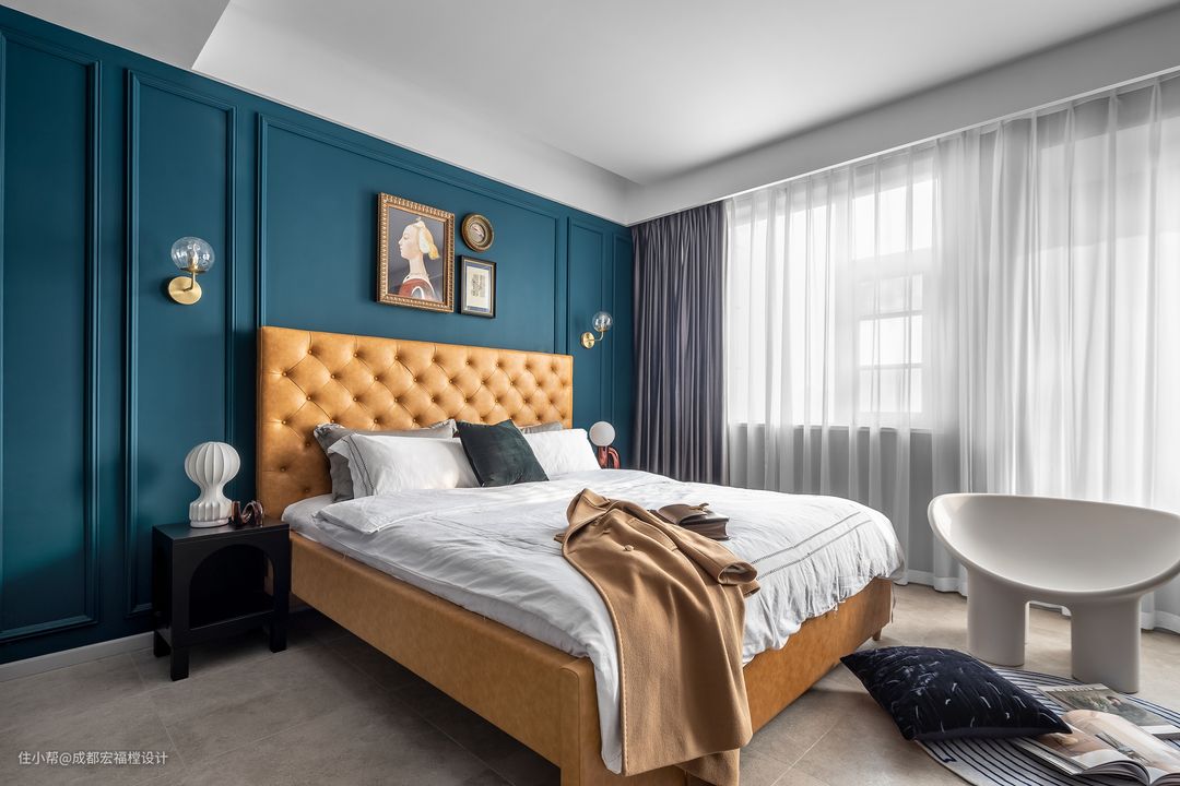 主卧室沿用客厅主调摩洛哥蓝同样加上石膏线条组合搭配太妃糖色高靠背床体、让空间富有节奏感同时不失复古高级感。#宏福樘设计 #迷人生活 #卧室 #床 #台灯 #挂画 #窗帘
