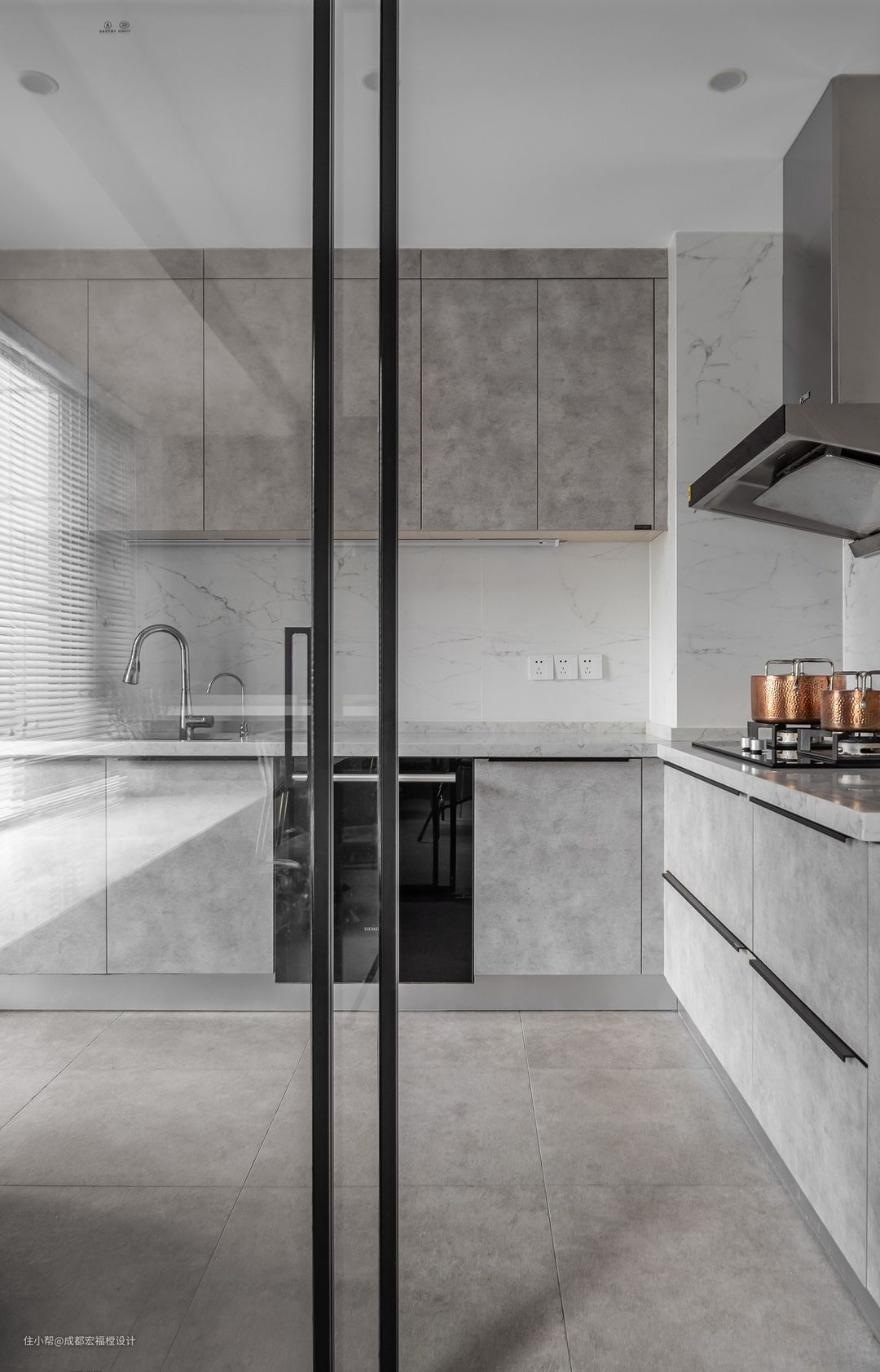 灰色岩板搭配大理石瓷砖,让一日三餐似乎也不那么枯燥无趣,倍感舒适放松。极窄边框玻璃门让空间更开阔通透。#宏福樘设计 #迷人生活 #厨房 #橱柜