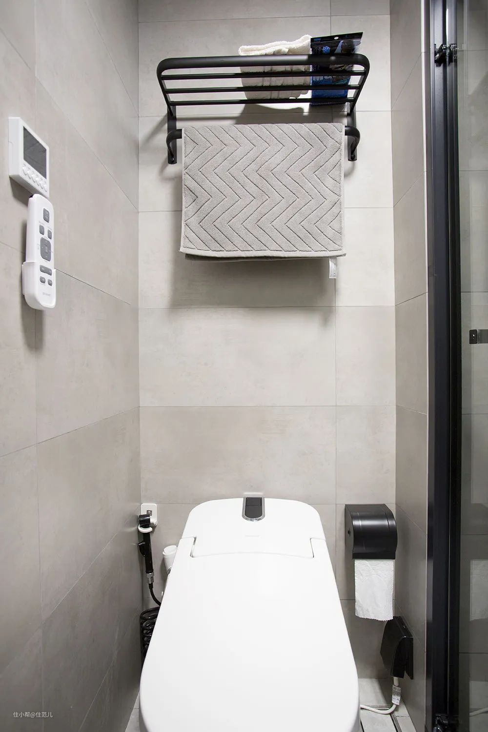 延续玄关高级黑白灰格调,浴室柜台面不大,客户自己搭了个简约黑色墙上置物架,满足日常洗漱用品收纳。