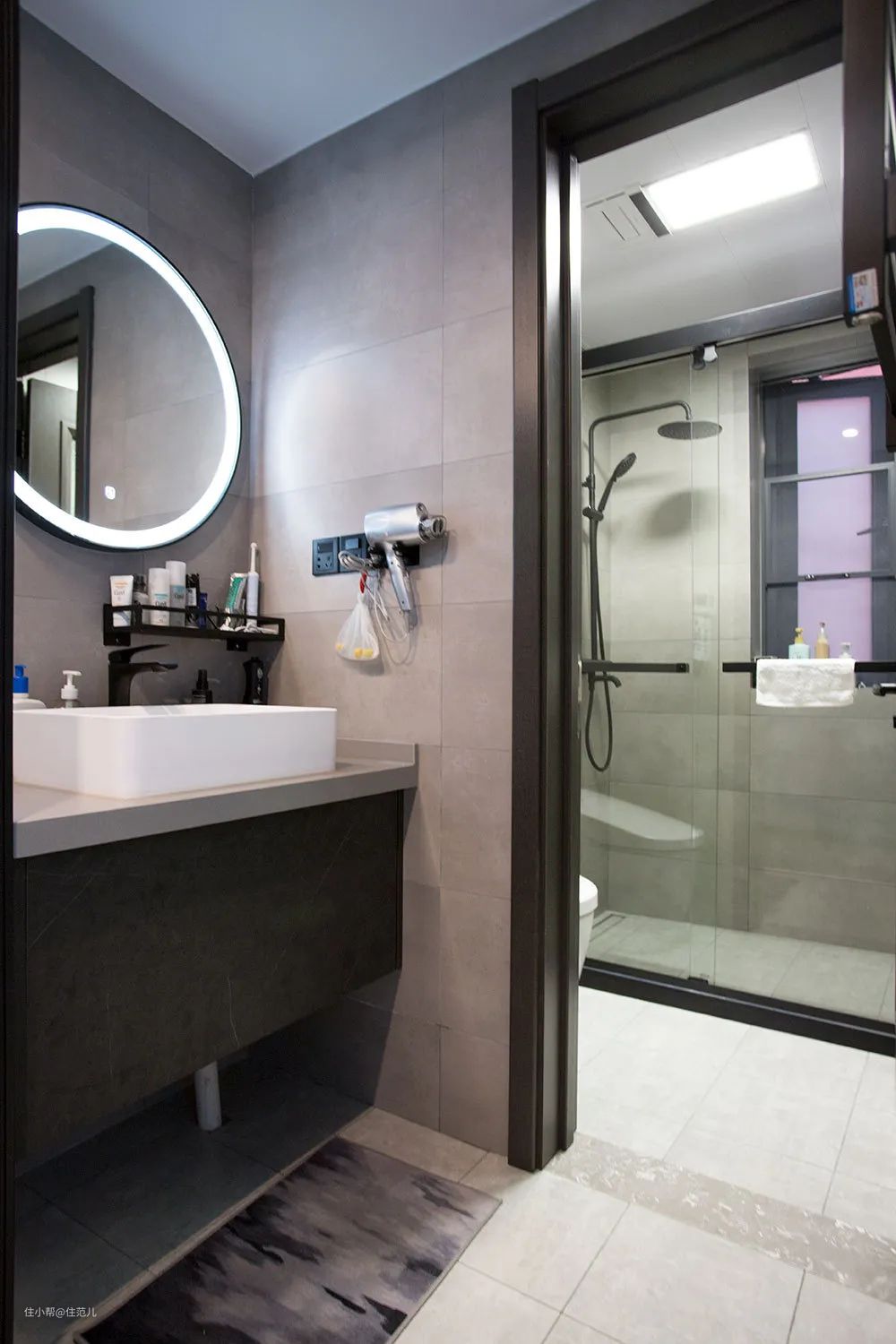 延续玄关高级黑白灰格调,浴室柜台面不大,客户自己搭了个简约黑色墙上置物架,满足日常洗漱用品收纳。