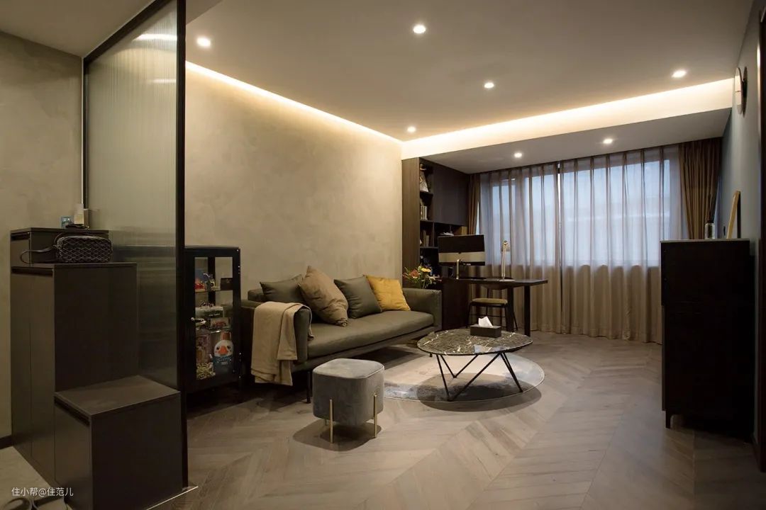 为了避免开门一眼望穿客厅,玄关与客厅衔接处特意做了长虹玻璃轻隔断,保有私密性;同时引入来自南向客厅的自然光线,通透性强。
