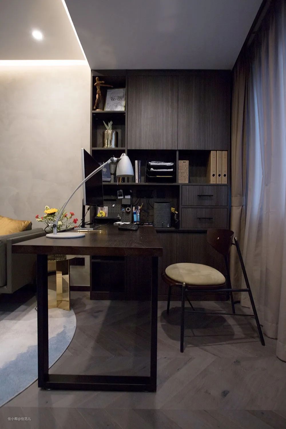 深色木制写字台和顶天立地书柜、不同隔层的规划设计,取用物品方便,也能成为收纳柜装饰本身。