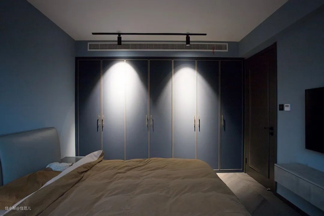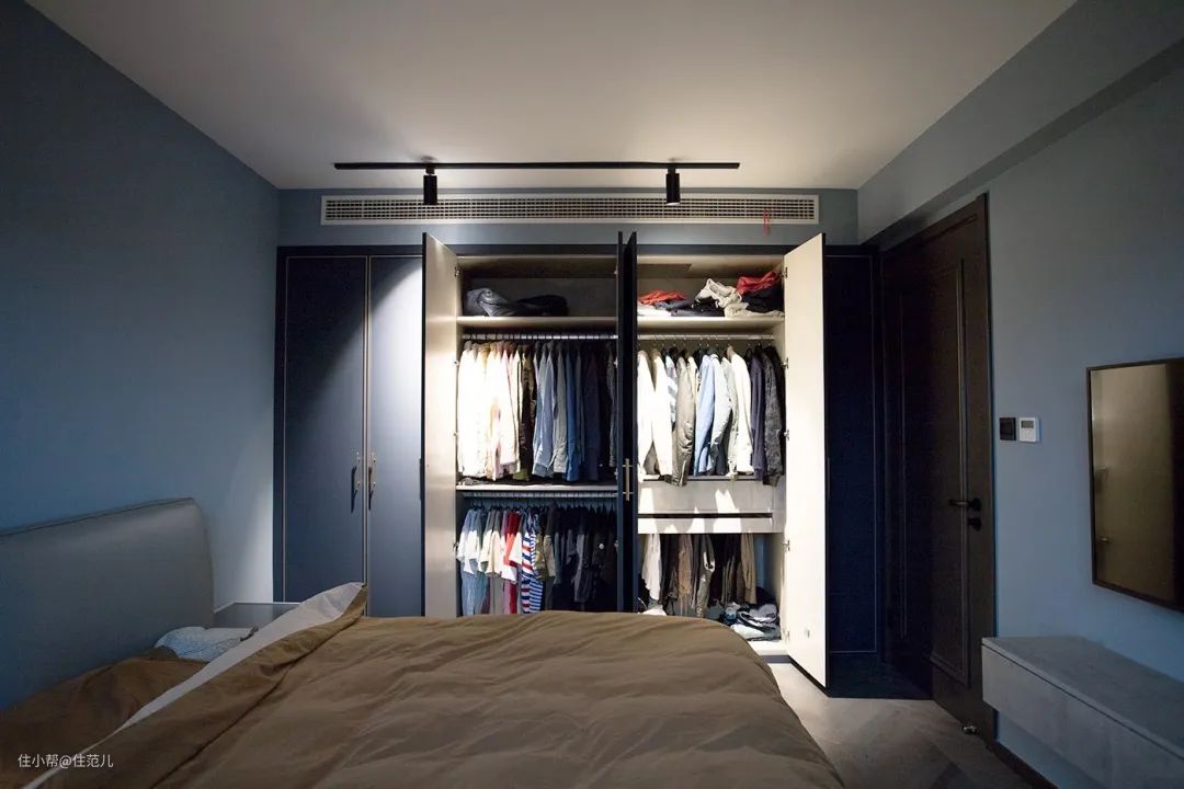 进门右手边,与墙面蓝色系偏深的通顶衣柜,所有物品都在呼应主色调,一点都不会显突兀。