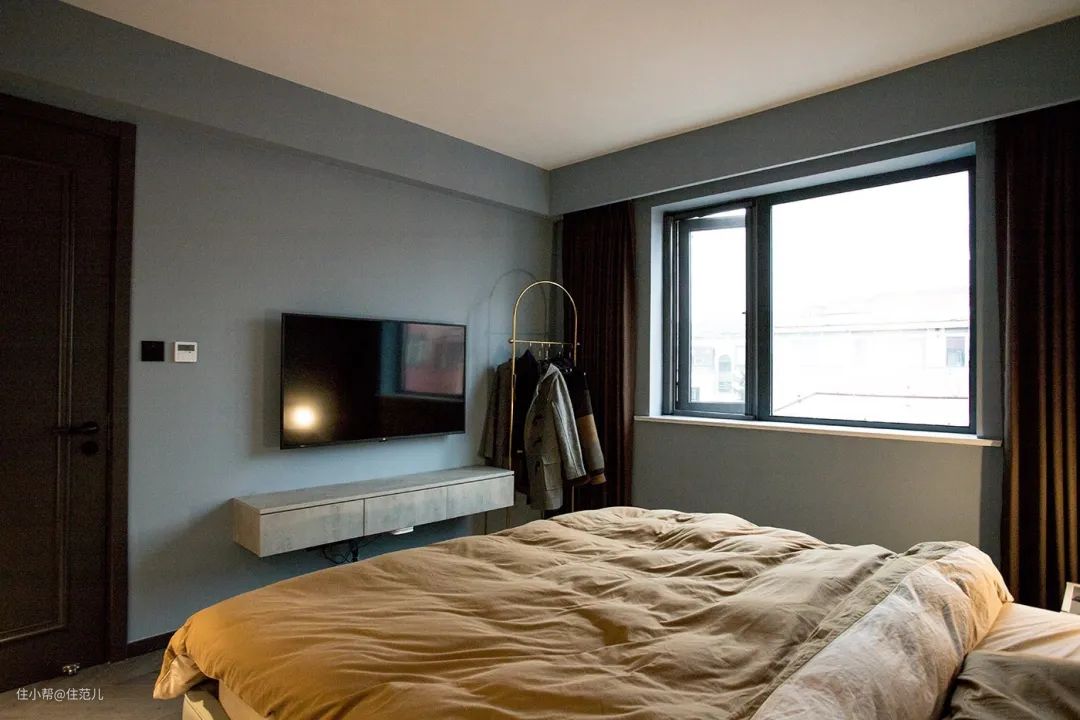 走进卧室,可以看出屋主非常清楚自己的喜好,依旧主色调贯穿全屋,但采用了饱和度更低的灰蓝色墙漆。