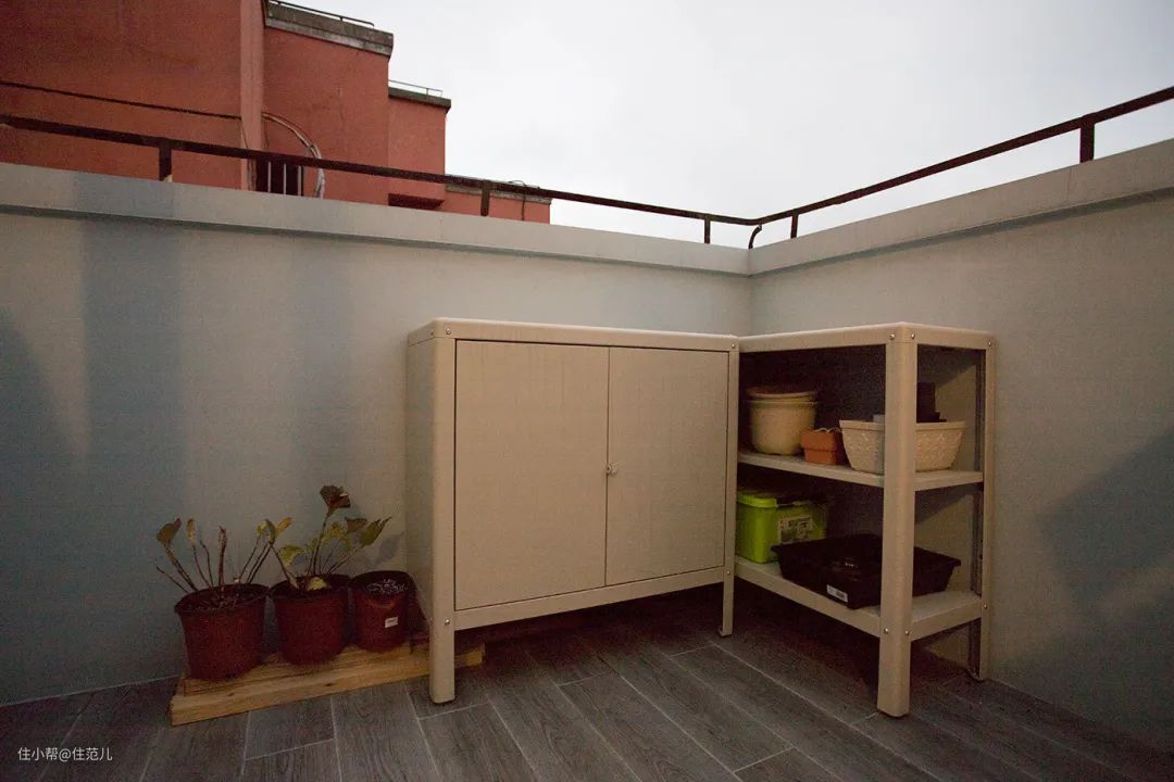 屋主家拥有一片开放式露台,有休闲桌椅,有耐潮的铁皮收纳矮柜,有花花草草。