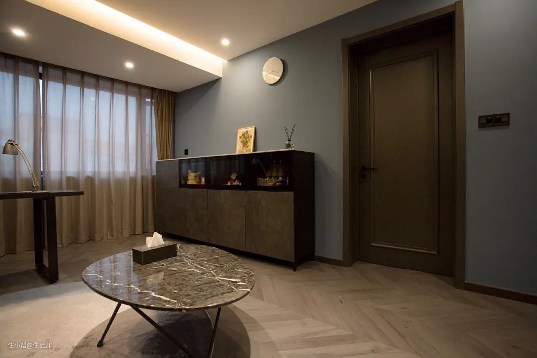 色彩选择上,通过使用不同层次的雾霾蓝和水泥灰,营造出冷静的全屋基调软装选配上,在定制柜外,选择石材、金属、皮质等元素提升质感。